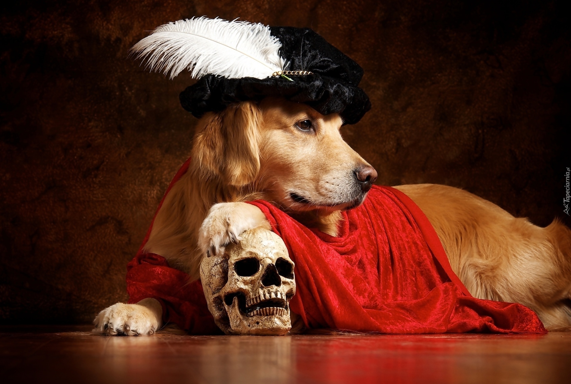 Edytor tapety: Pies, Czaszka, Czapka, Pióro, Golden Retriever
