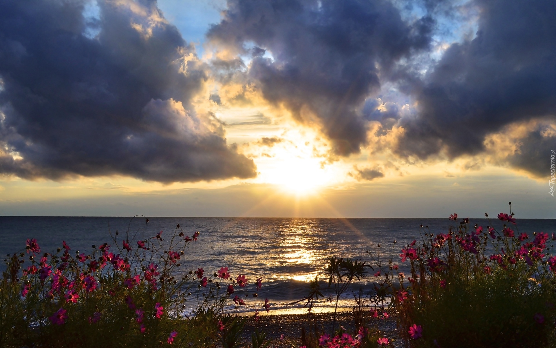 Edytor tapety: Morze, Chmury, Promienie, Słońca, Kwiaty