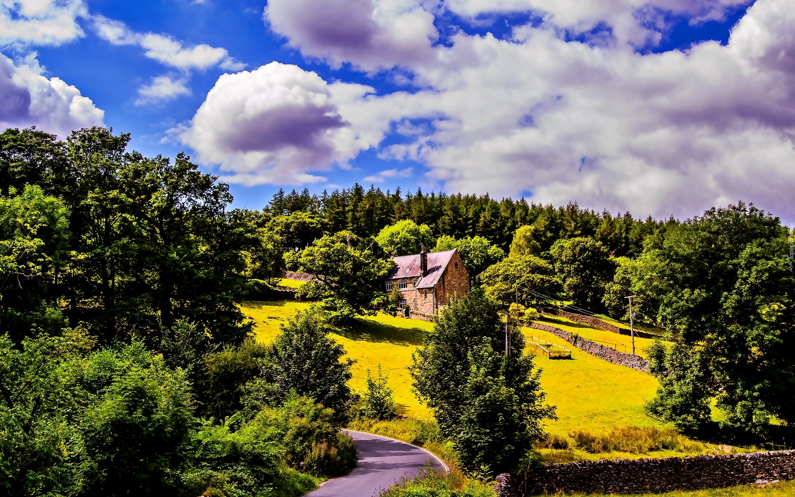 Edytor tapety: Las, Droga, Łąka, Dom, Obłoki, Przebijające, Światło