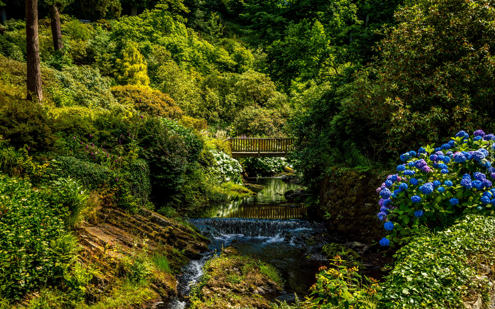Edytor tapety: Las, Rzeka, Kaskada, Mostek, Hortensje, Światło, Cień