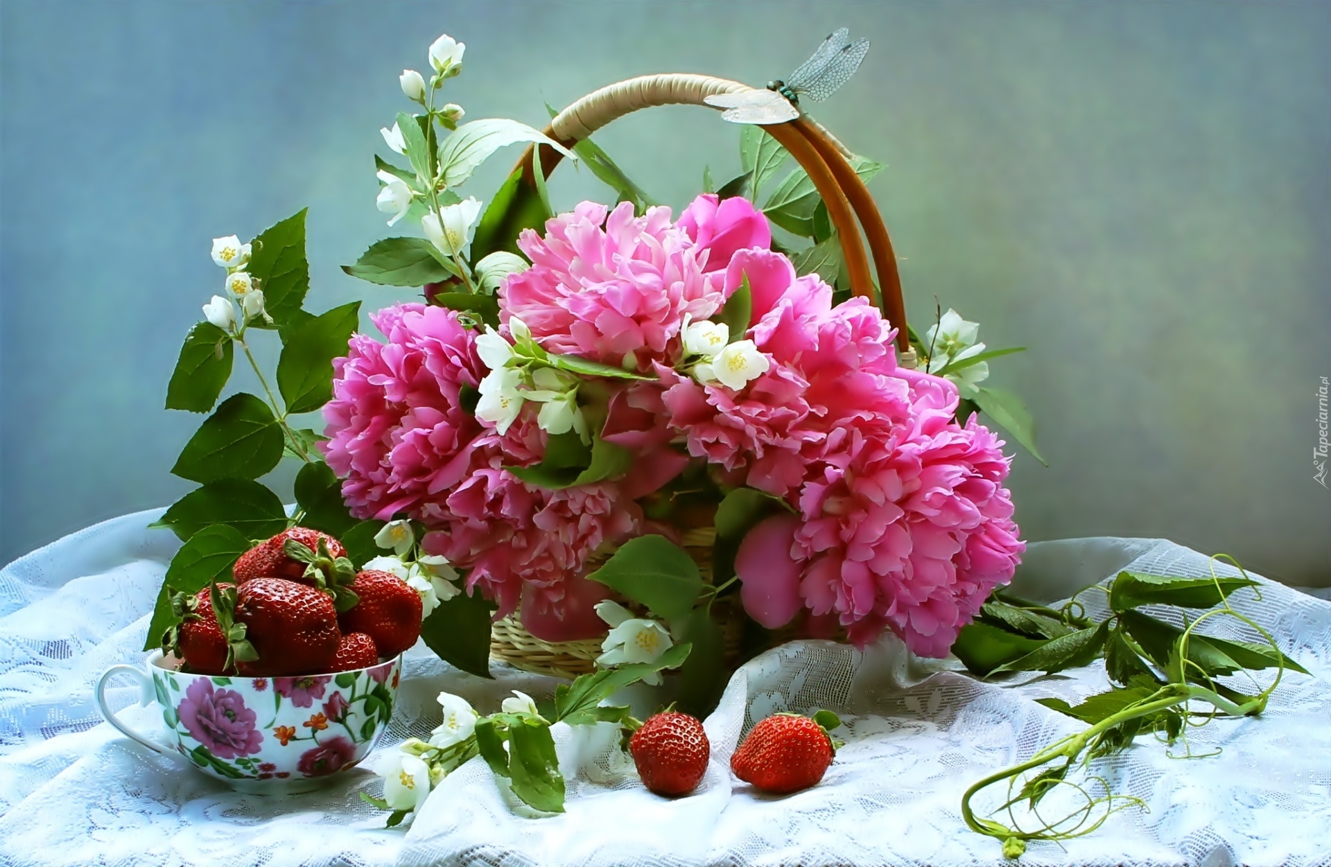 Edytor tapety: Piwonie, Koszyk, Truskawki