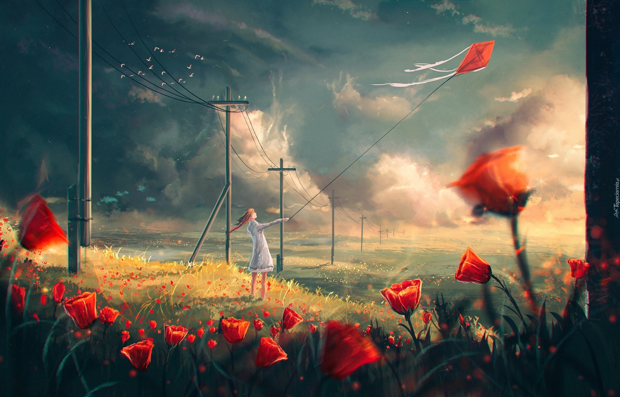 Edytor tapety: Grafika, Obraz, Dziewczynka, Łąka, Latawiec, Maki