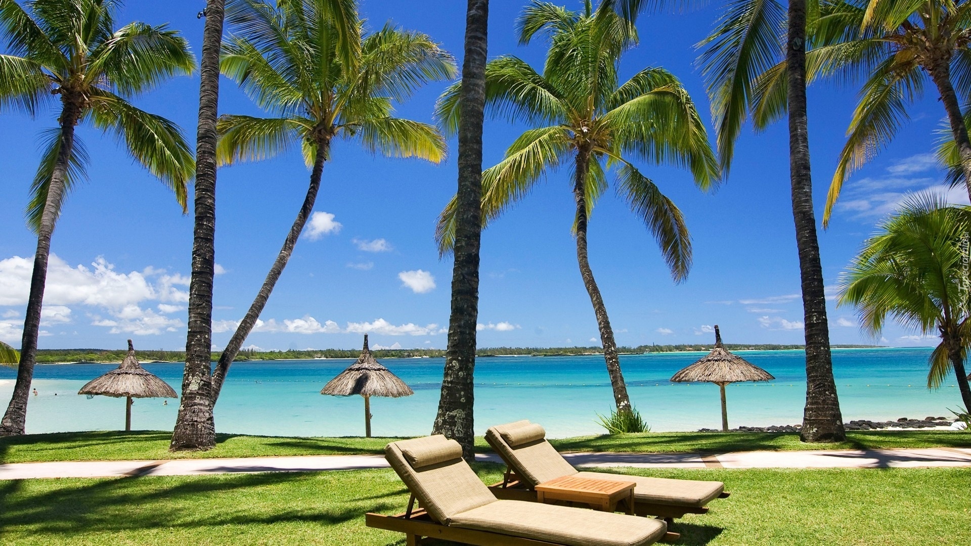 Edytor tapety: Lato, Plaża, Zieleń, Morze, Leżaki, Parasole