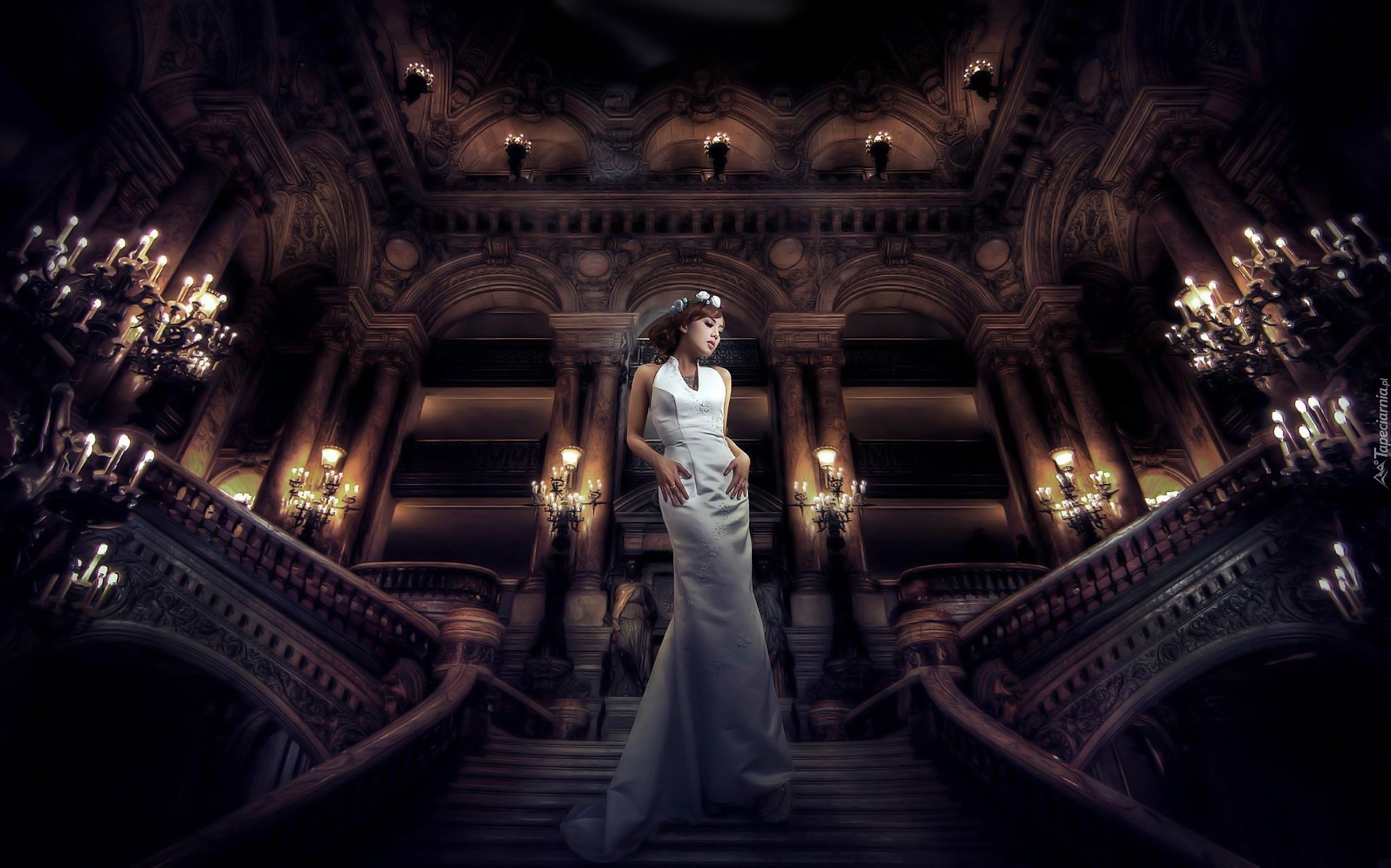 Edytor tapety: Kobieta, Schody, Biała, Suknia, Panna młoda