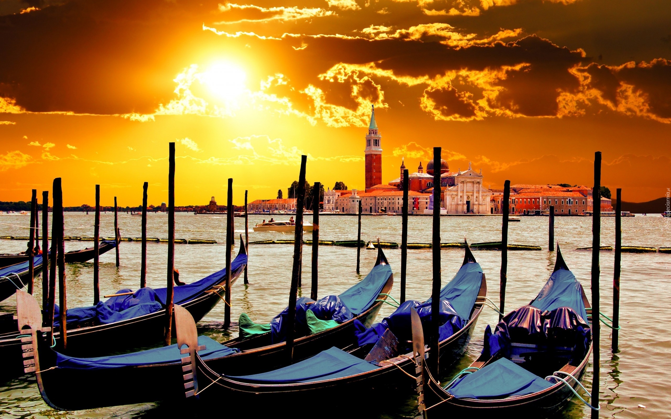 Edytor tapety: Gondole, Budynki, Chmury, Zachód, Słońca, Wenecja, Panorama