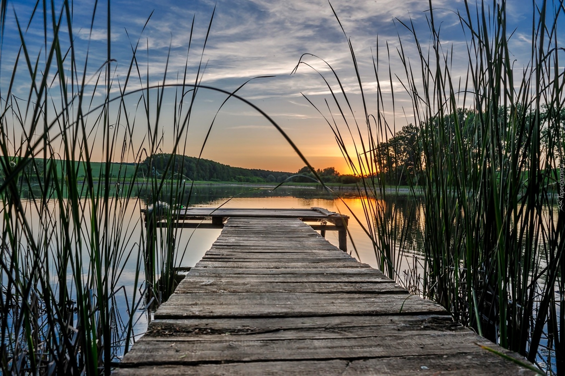 Edytor tapety: Zachód Słońca, Jezioro, Pomost, Rosliny