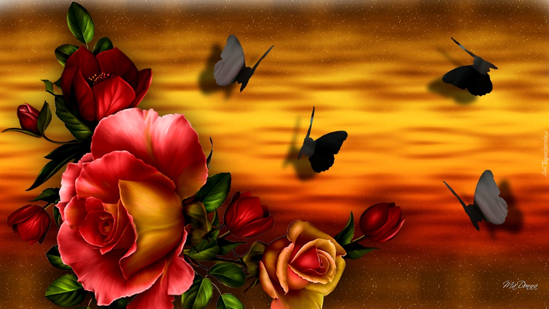 Edytor tapety: Róże, Motyle, Zachód Słońca, Art