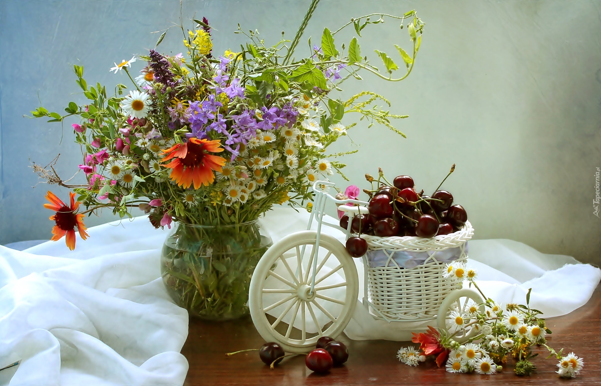 Edytor tapety: Bukiet Kwiatów, Wazon, Ozdobny Rowerek, Czereśnie, Kompozycja