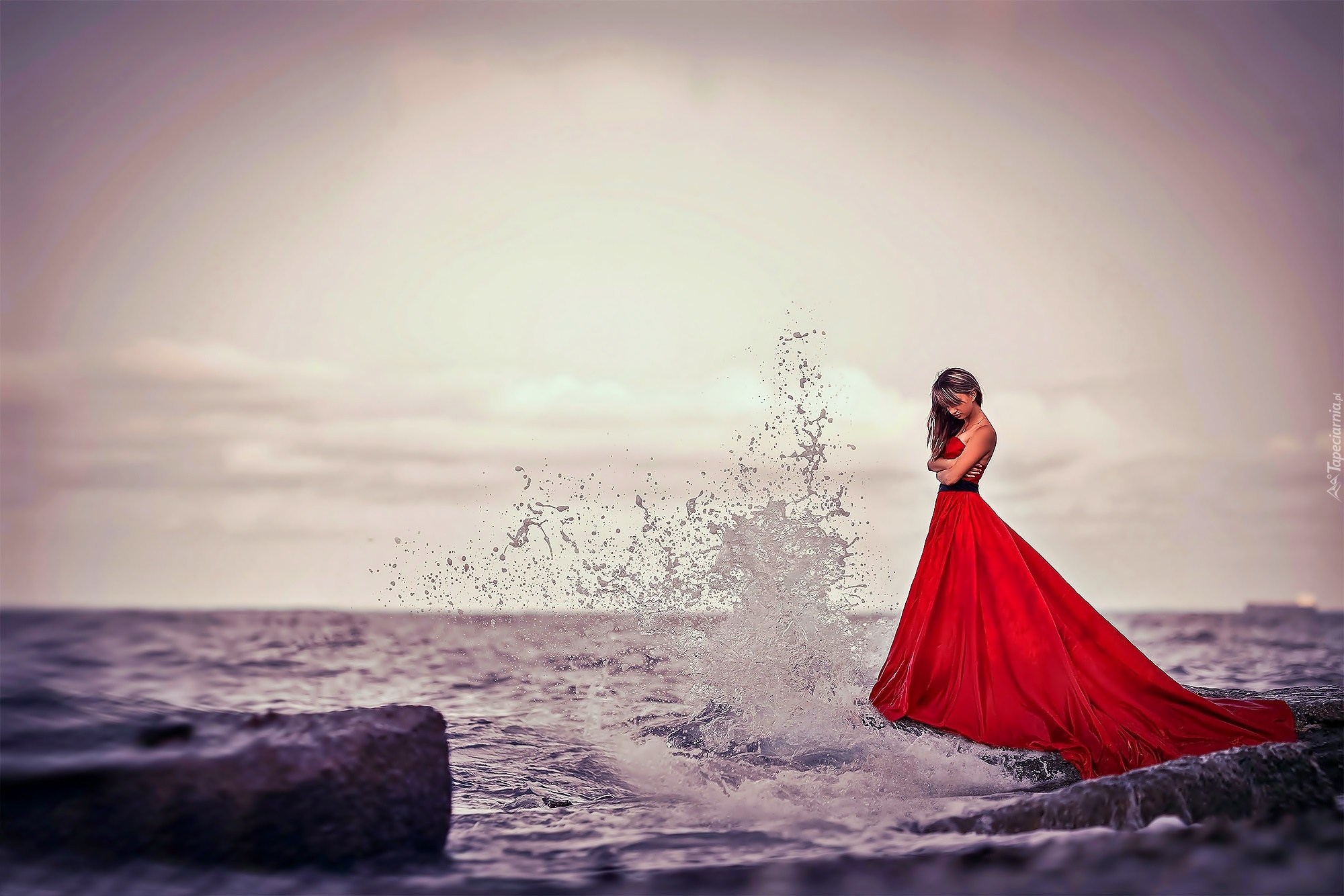 Edytor tapety: Morze, Skały, Fale, Dziewczyna, W Czerwonej, Sukni
