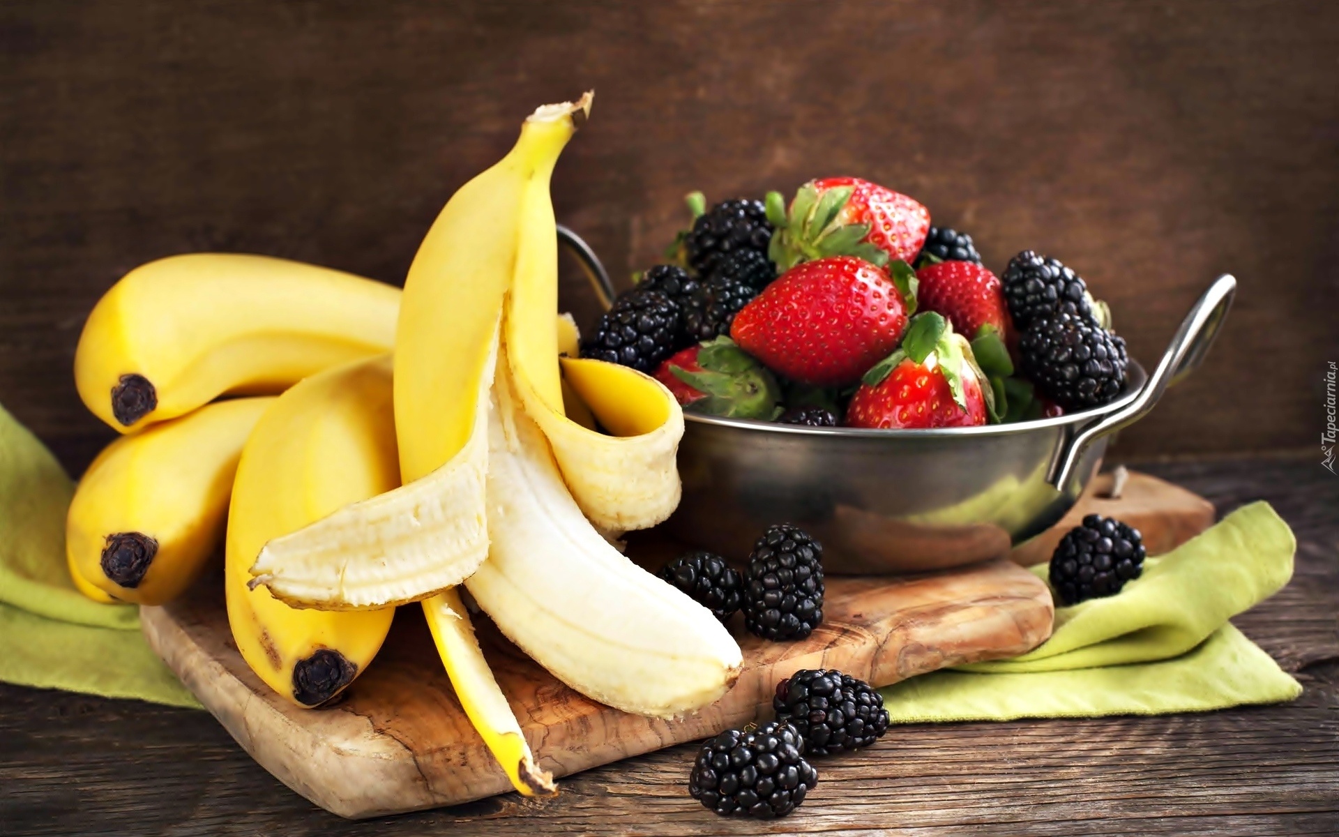Edytor tapety: Banany, Truskawki, Jeżyny, Miseczka, Deska