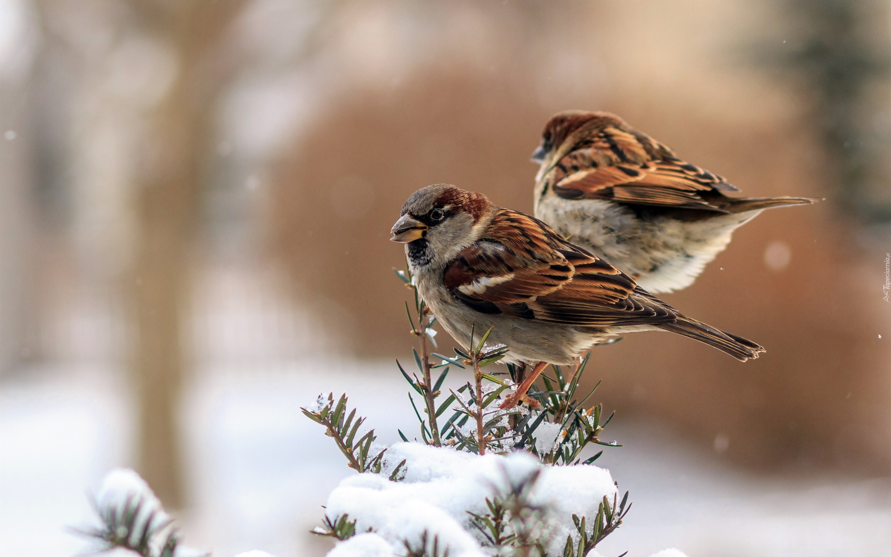 Edytor tapety: Wróble, Wróbelki, Ptaki, Gałązki, Śnieg