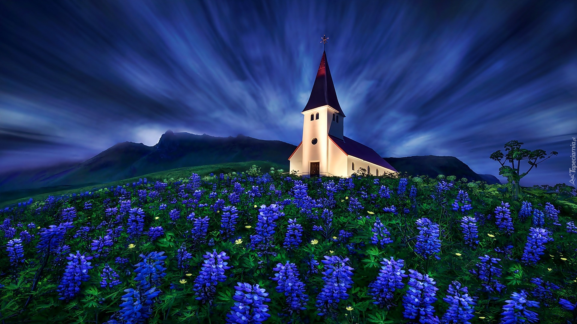 Edytor tapety: Łąka, Kościół, Chmury, Światło, Cień