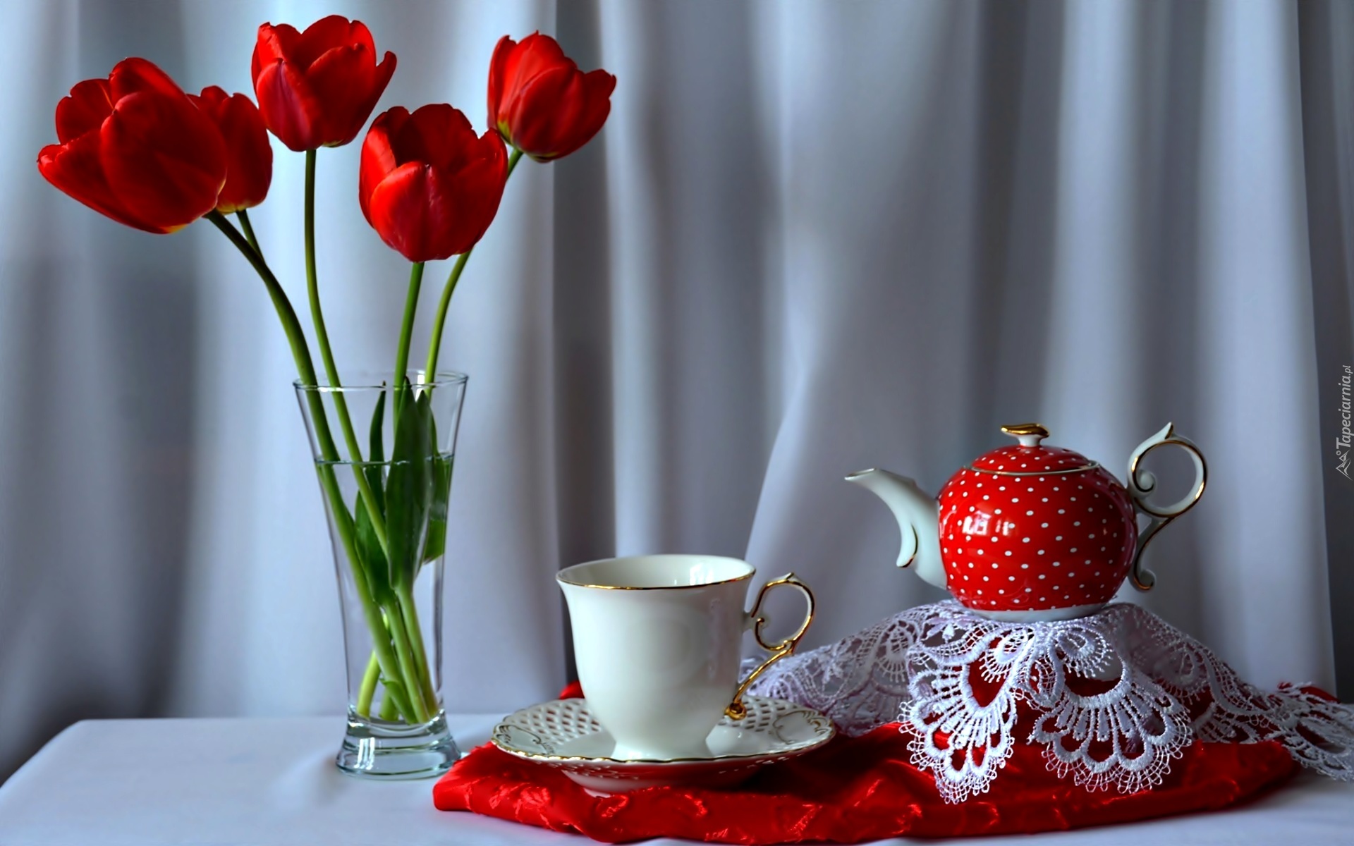 Edytor tapety: Kompozycja, Bukiet, Kwiatów, Tulipany, Filizanka, Imbryk, Serwetka