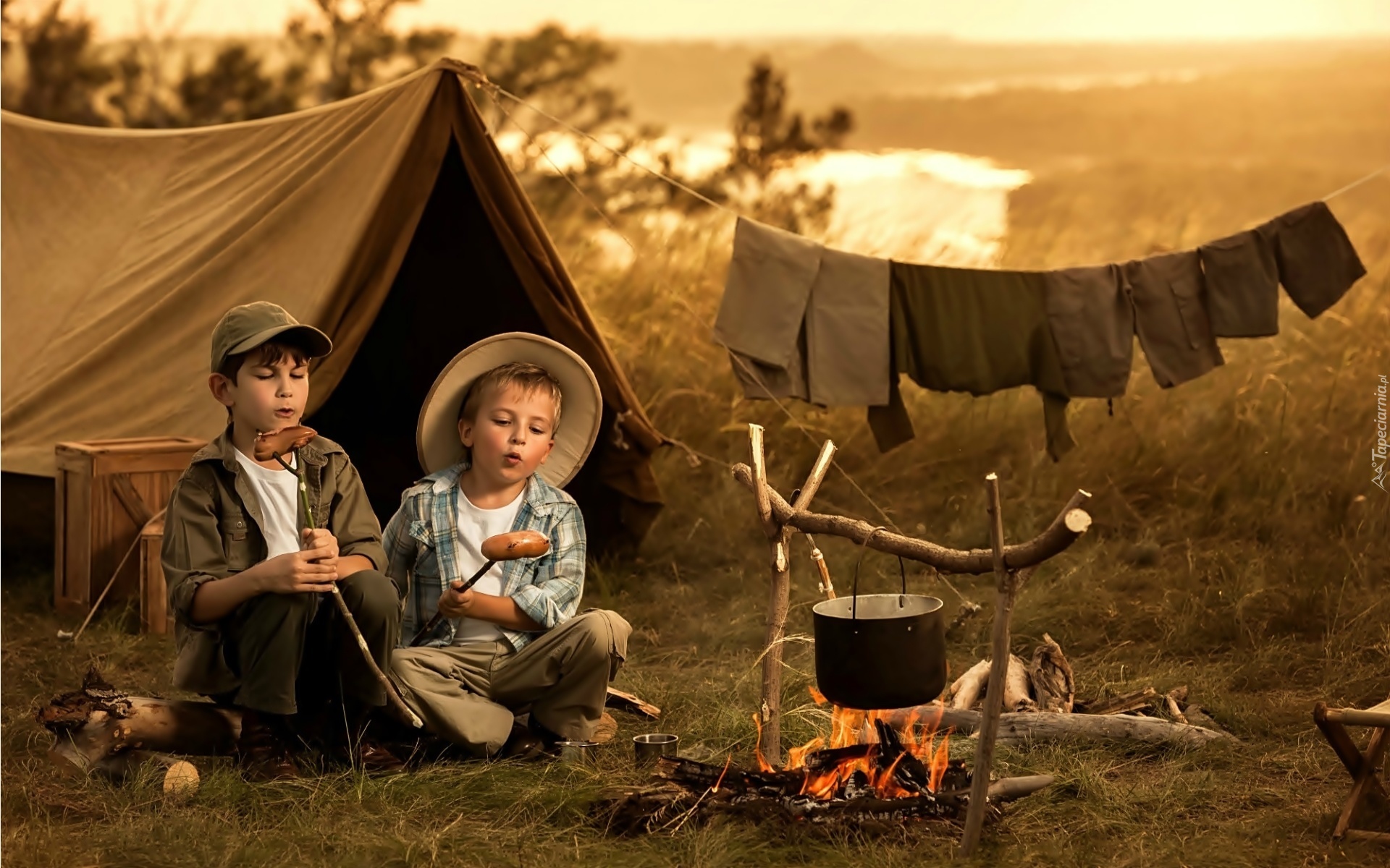 Edytor tapety: Chłopcy, Namiot, Ognisko, Góra, Jezioro, Biwak