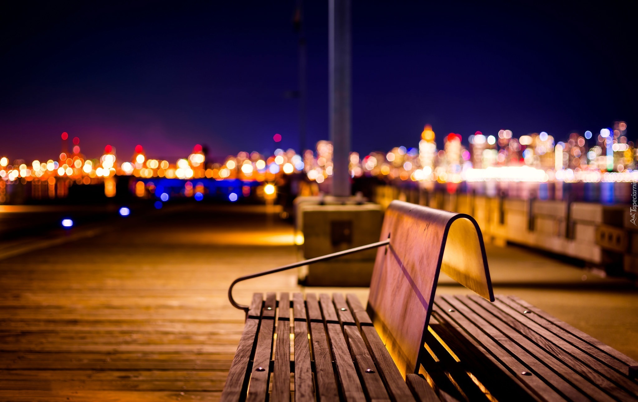 Edytor tapety: Vancouver, Kanada, Miasto Nocą, Bokeh, Molo, Ławka