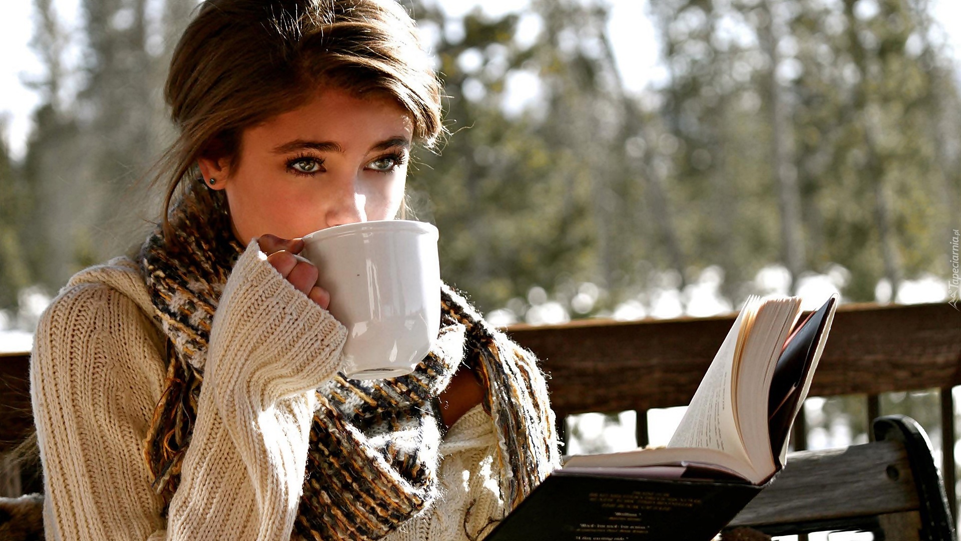 Edytor tapety: Dziewczyna, Książka, Szalik, Kubek