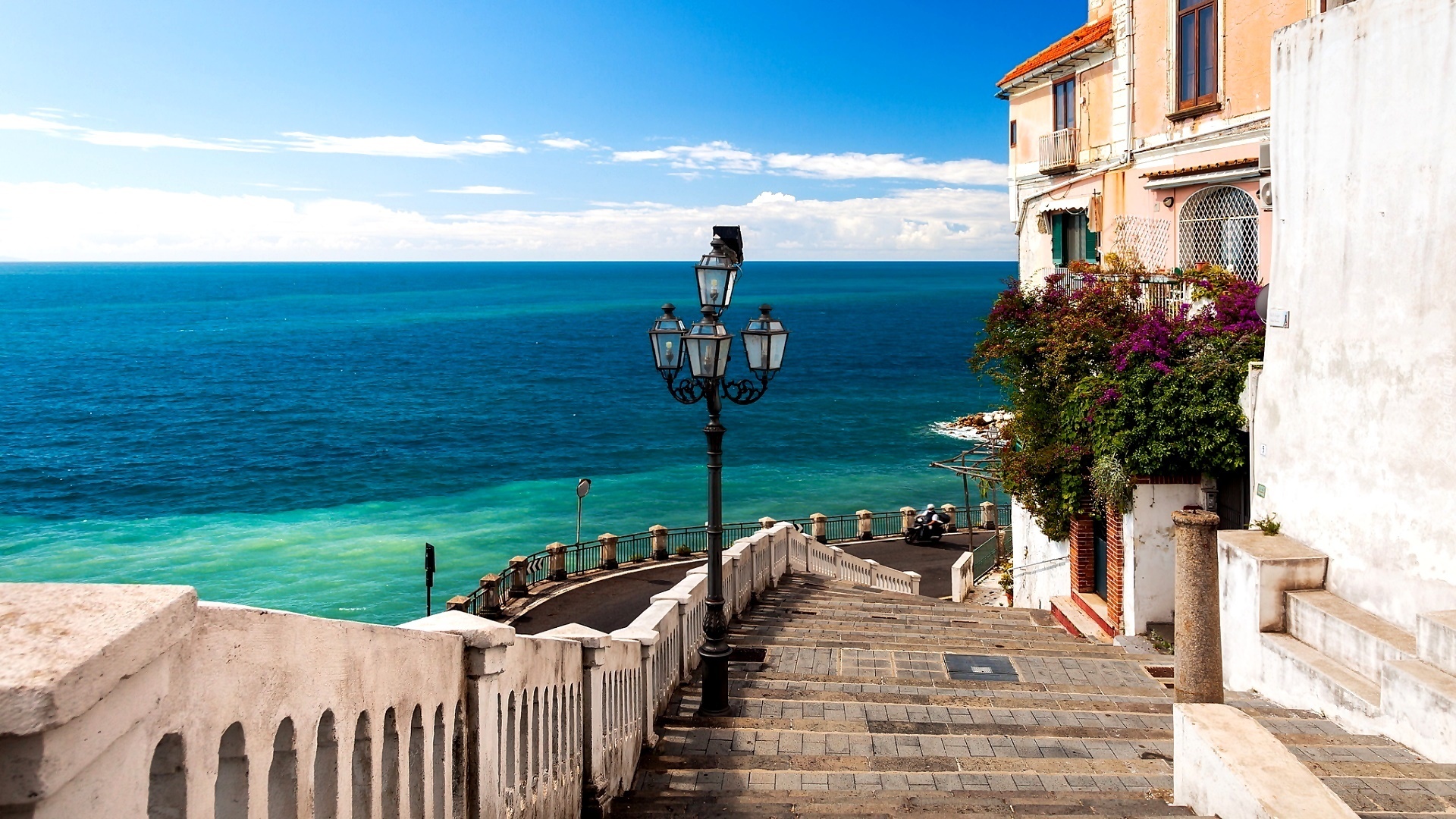Edytor tapety: Atrani, Włochy, Morze, Domy, Latarnia, Schody