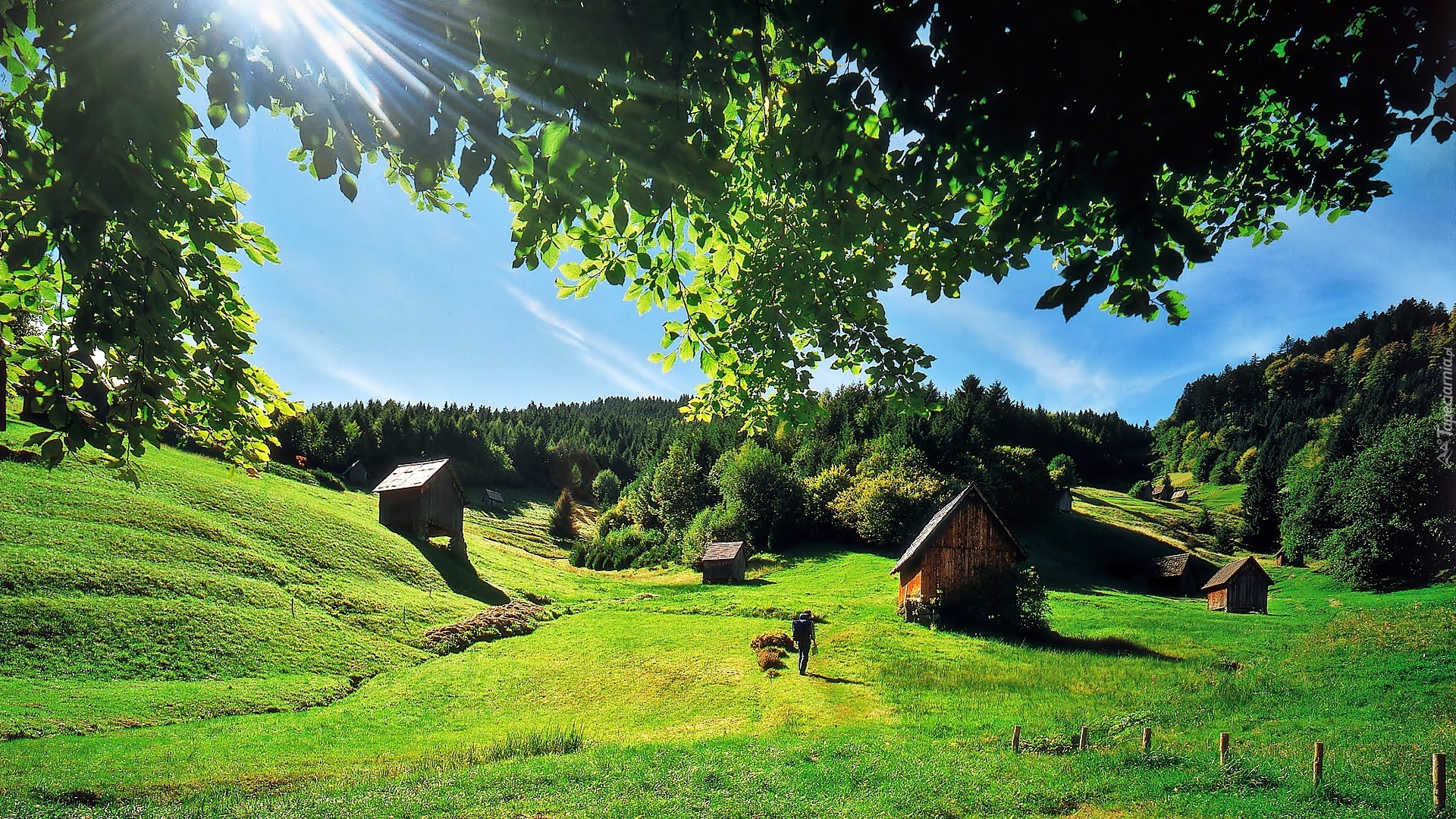 Edytor tapety: Las, Łąka, Szopy, Promienie, Słońca