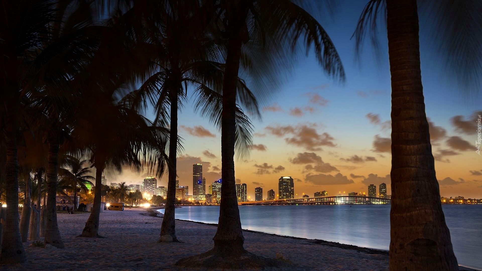 Edytor tapety: Plaża, Wybrzeże, Palmy, Miasto, Zmierzch