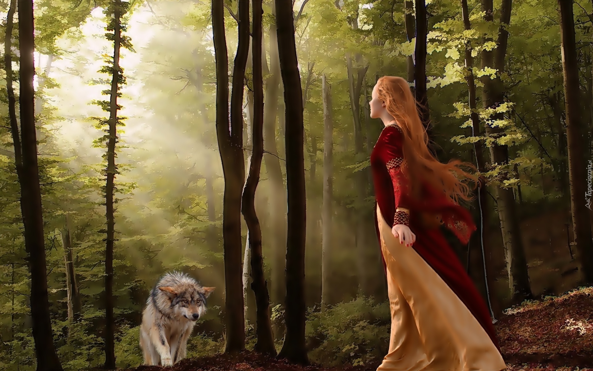 Edytor tapety: Dziewczyna, Las, Wilk, Przebijające Światło