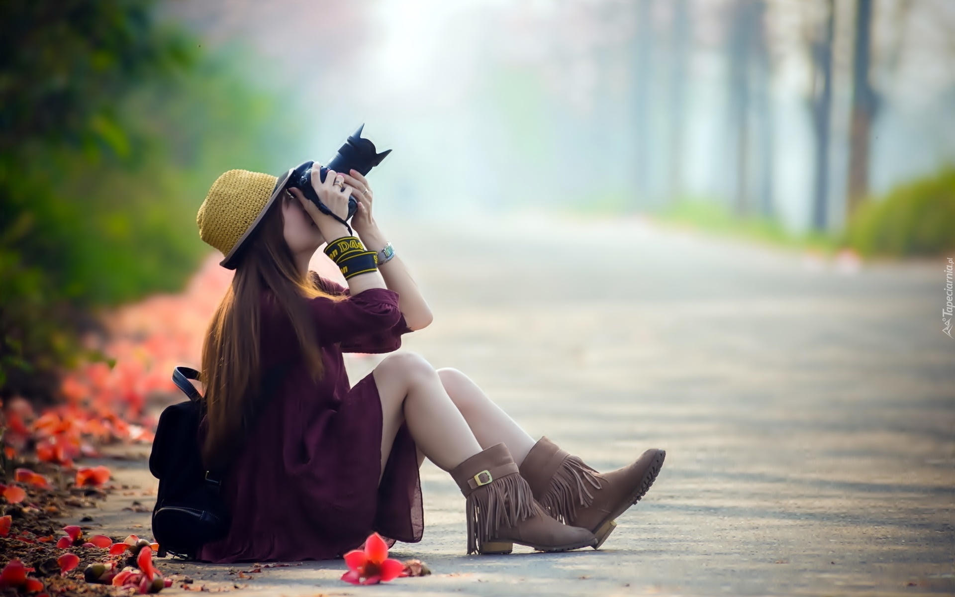 Edytor tapety: Dziewczyna, Droga, Las, Kwiatki, Aparat, Fotograficzny