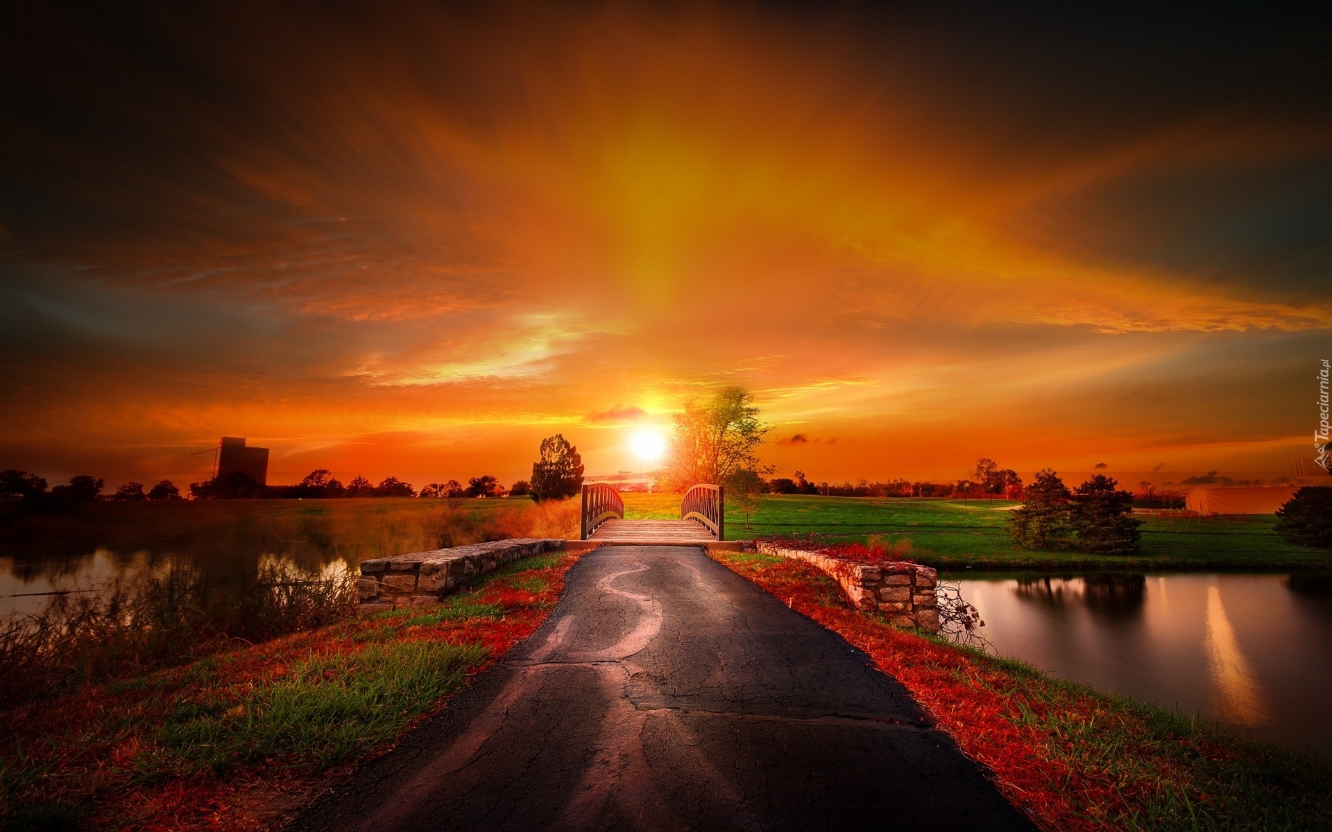 Edytor tapety: Zachód Słońca, Droga, Rzeka, Most