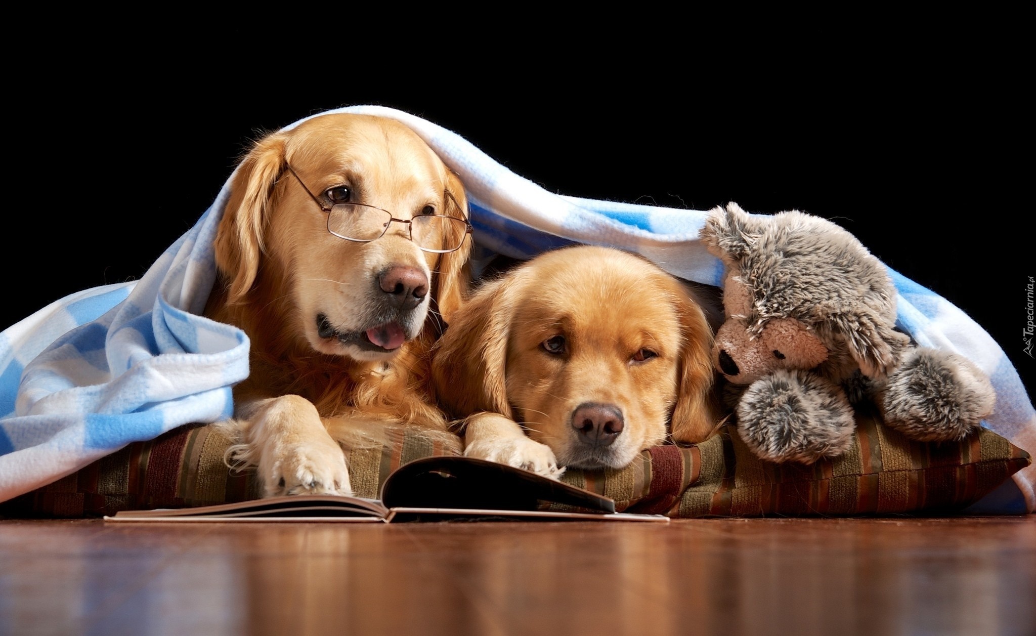Edytor tapety: Dwa, Psy, Zabawka, Książka, Golden Retriever