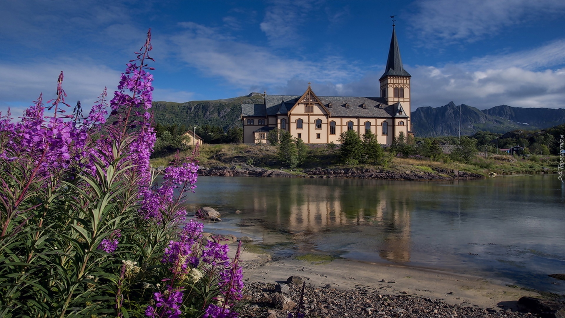 Edytor tapety: Norwegia, Rzeka, Budynek, Purpurowe, Kwiaty, Góry