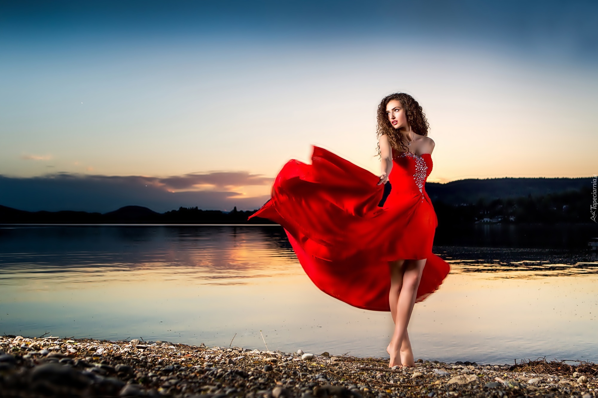 Edytor tapety: Kobieta, Czerwona, Sukienka, Jezioro