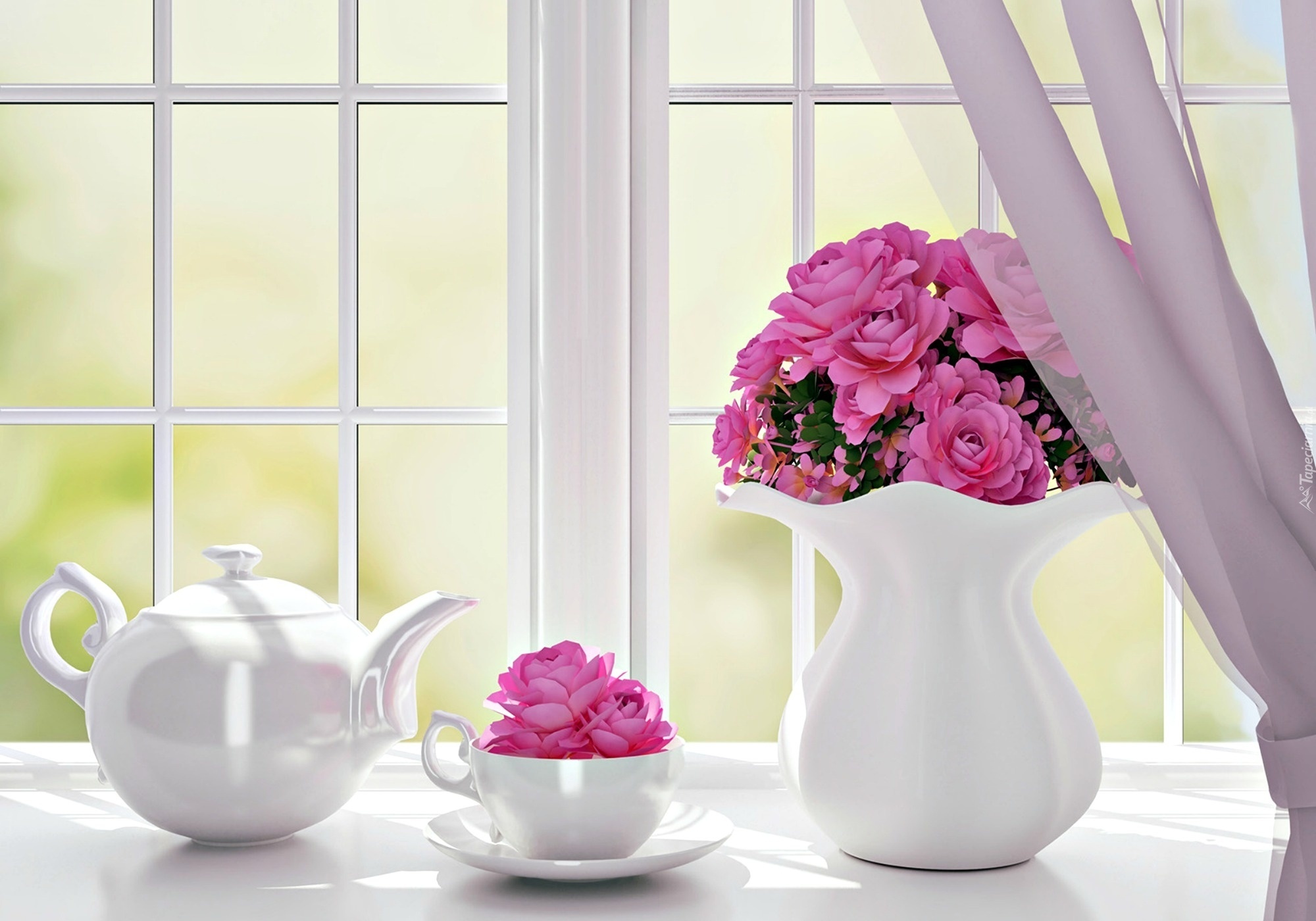 Edytor tapety: Dekoracja, Okno, Firanka, Wazon, Kwiaty, Dzbanek