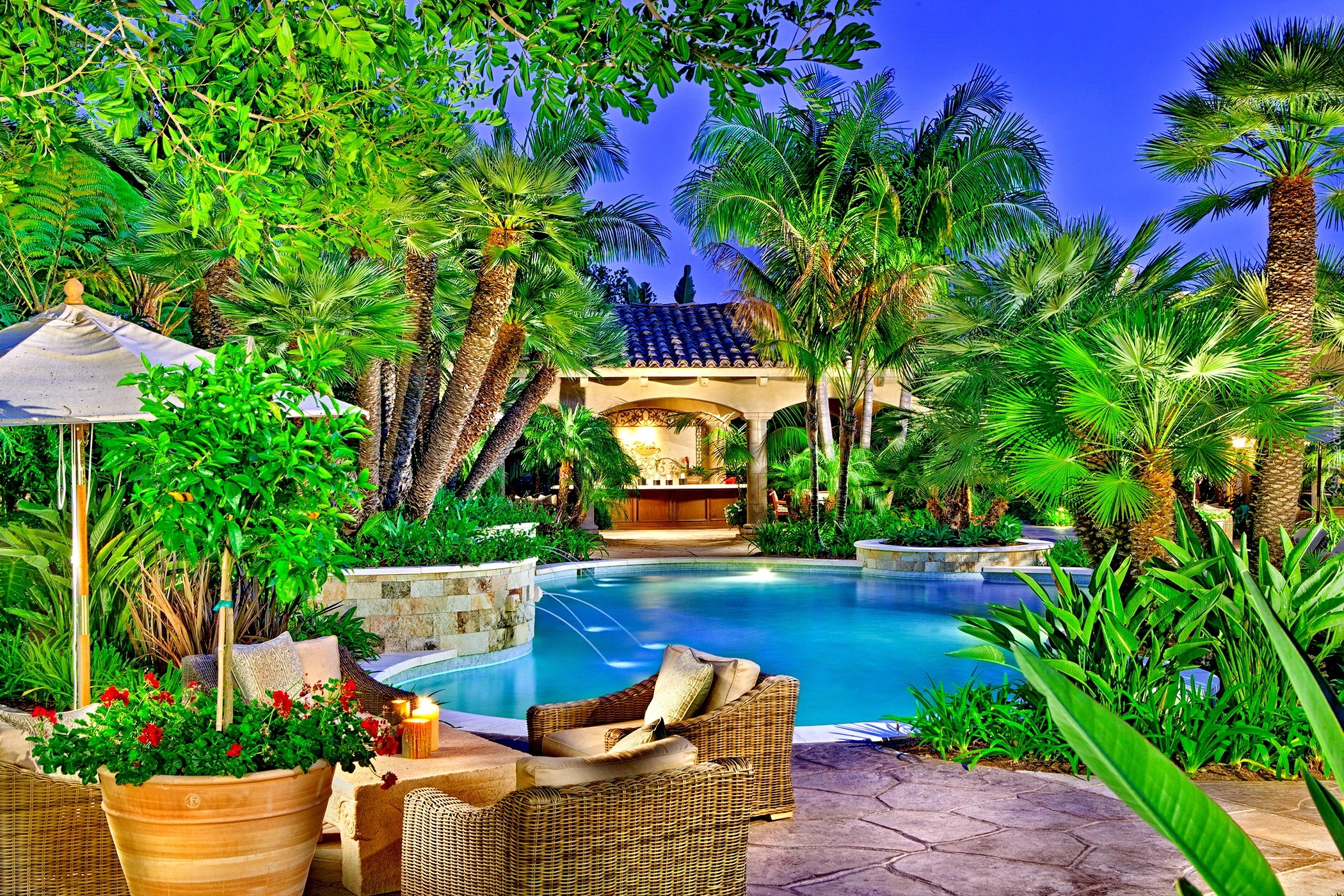 Edytor tapety: Basen, Zieleń, Fotele, Parasol, Dom