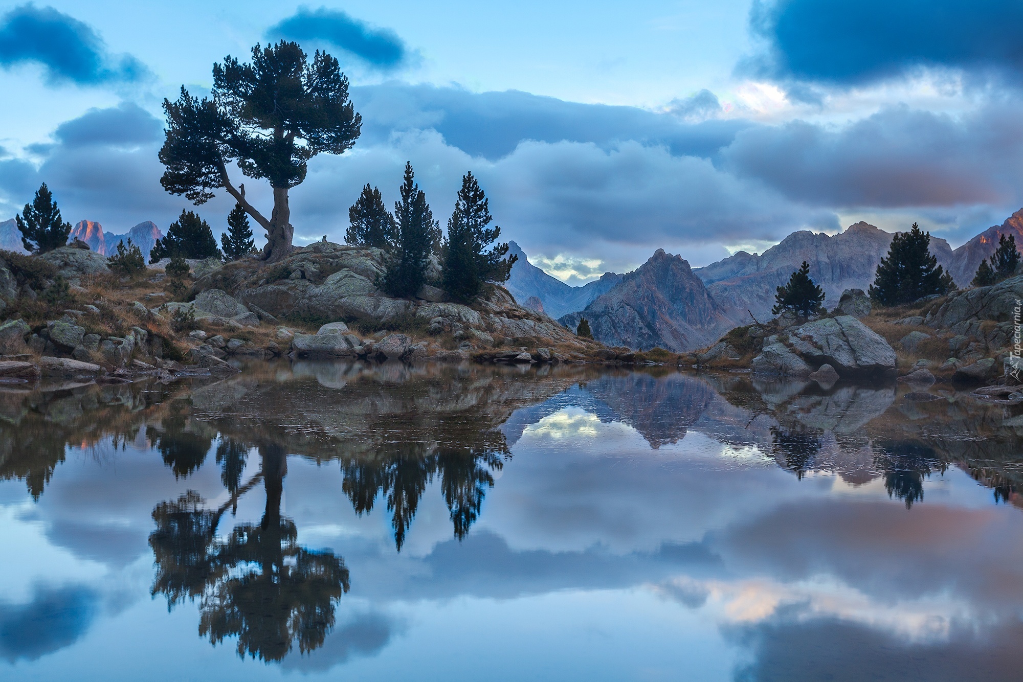 Edytor tapety: Niebo, Skały, Drzewa, Jezioro