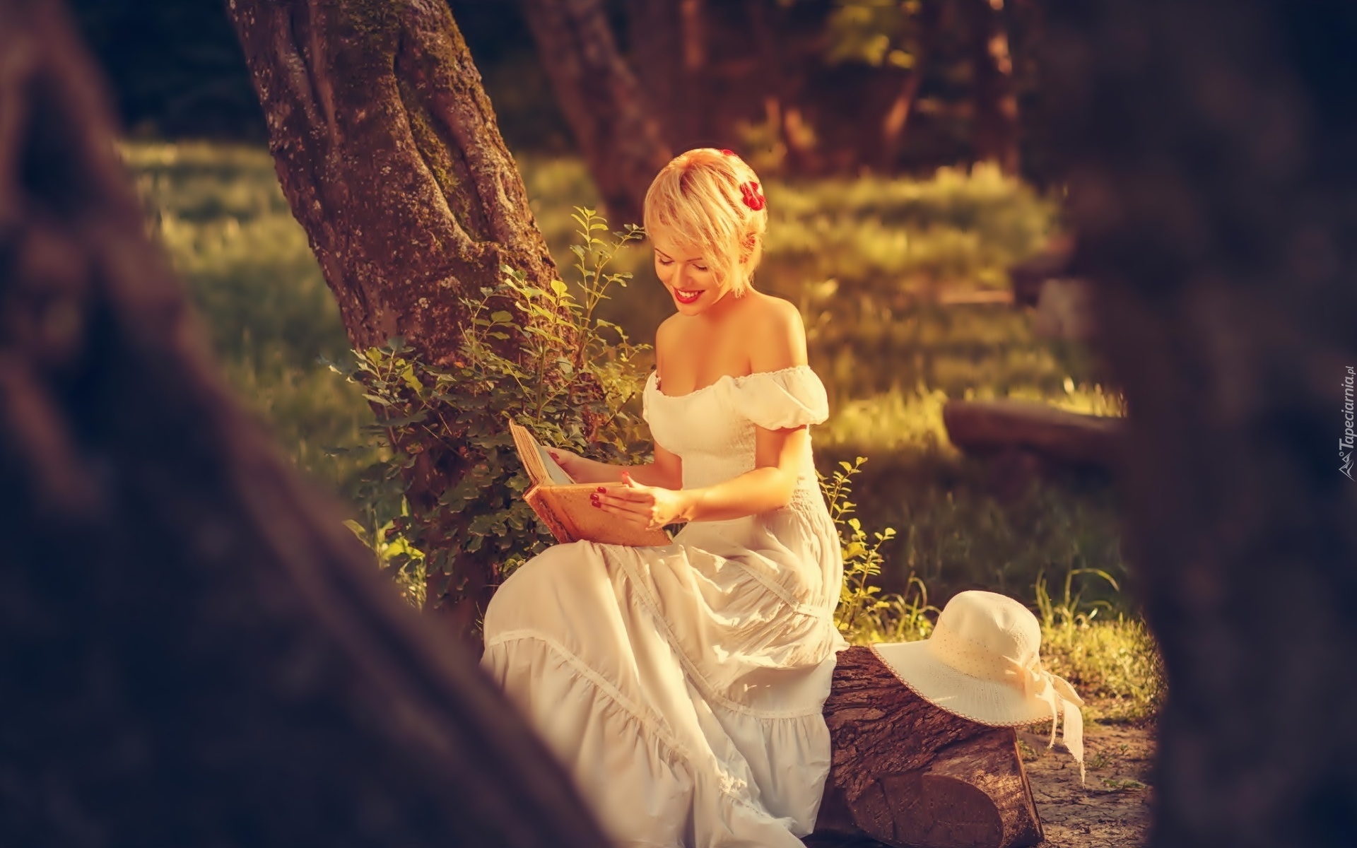 Edytor tapety: Dziewczyna, Blondynka, Drzewo, Książka, Kapelusz, Las