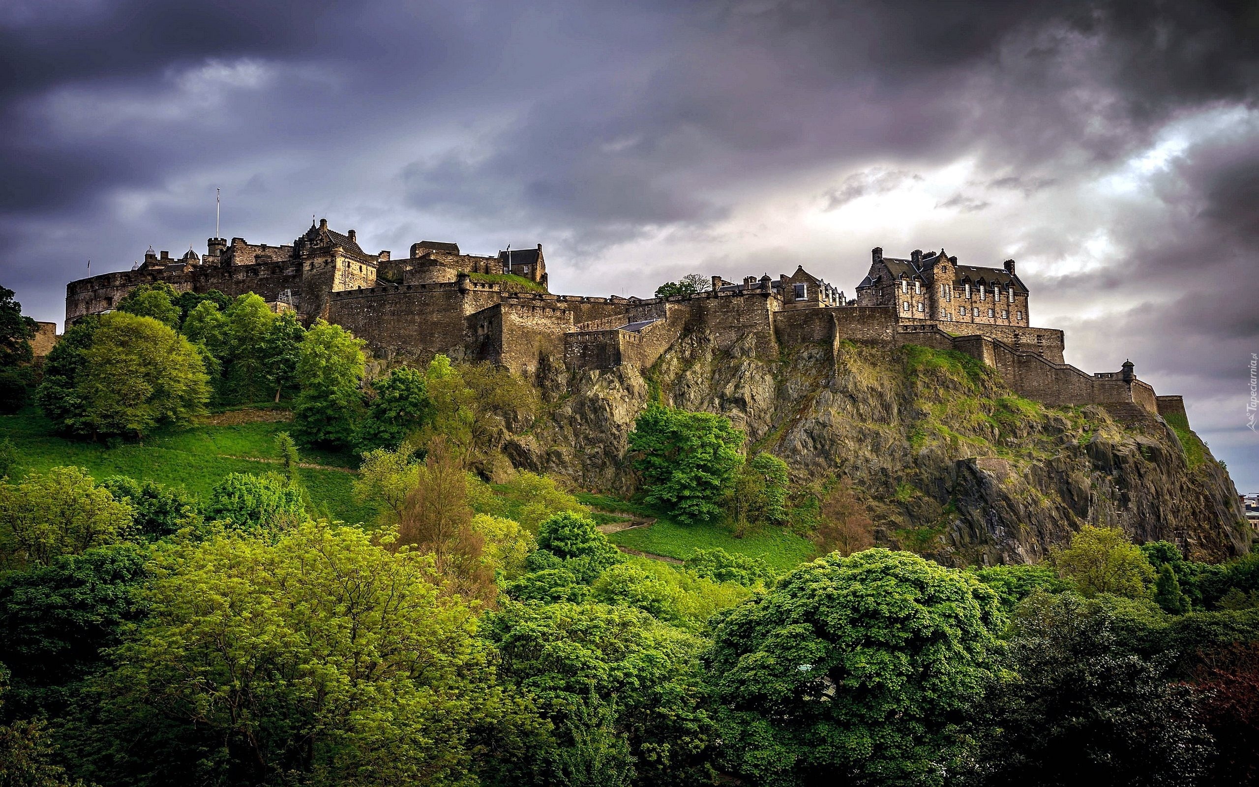 Edytor tapety: Zamek w Edynburgu, Edinburgh Castle, Szkocja, Edynburg, Skały, Drzewa, Wzgórze