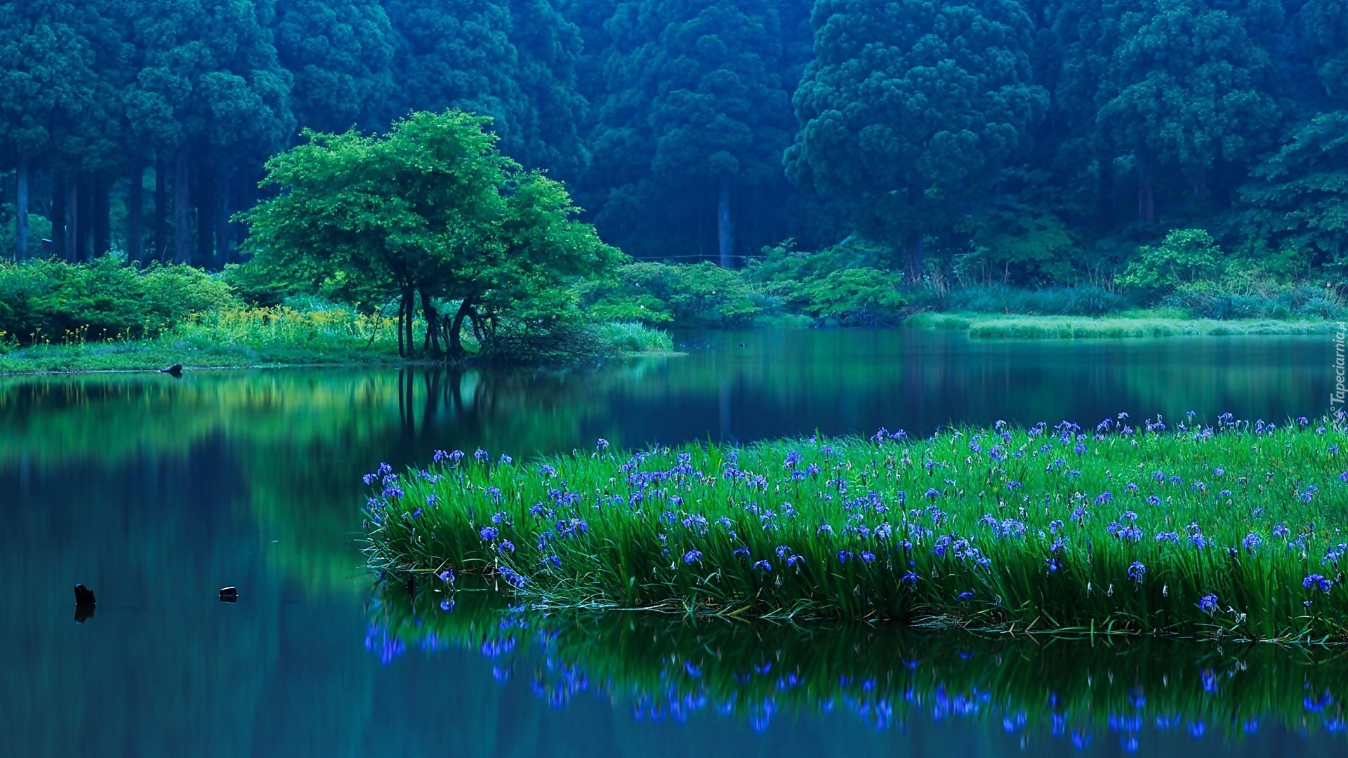 Edytor tapety: Jezioro, Las, Irysy