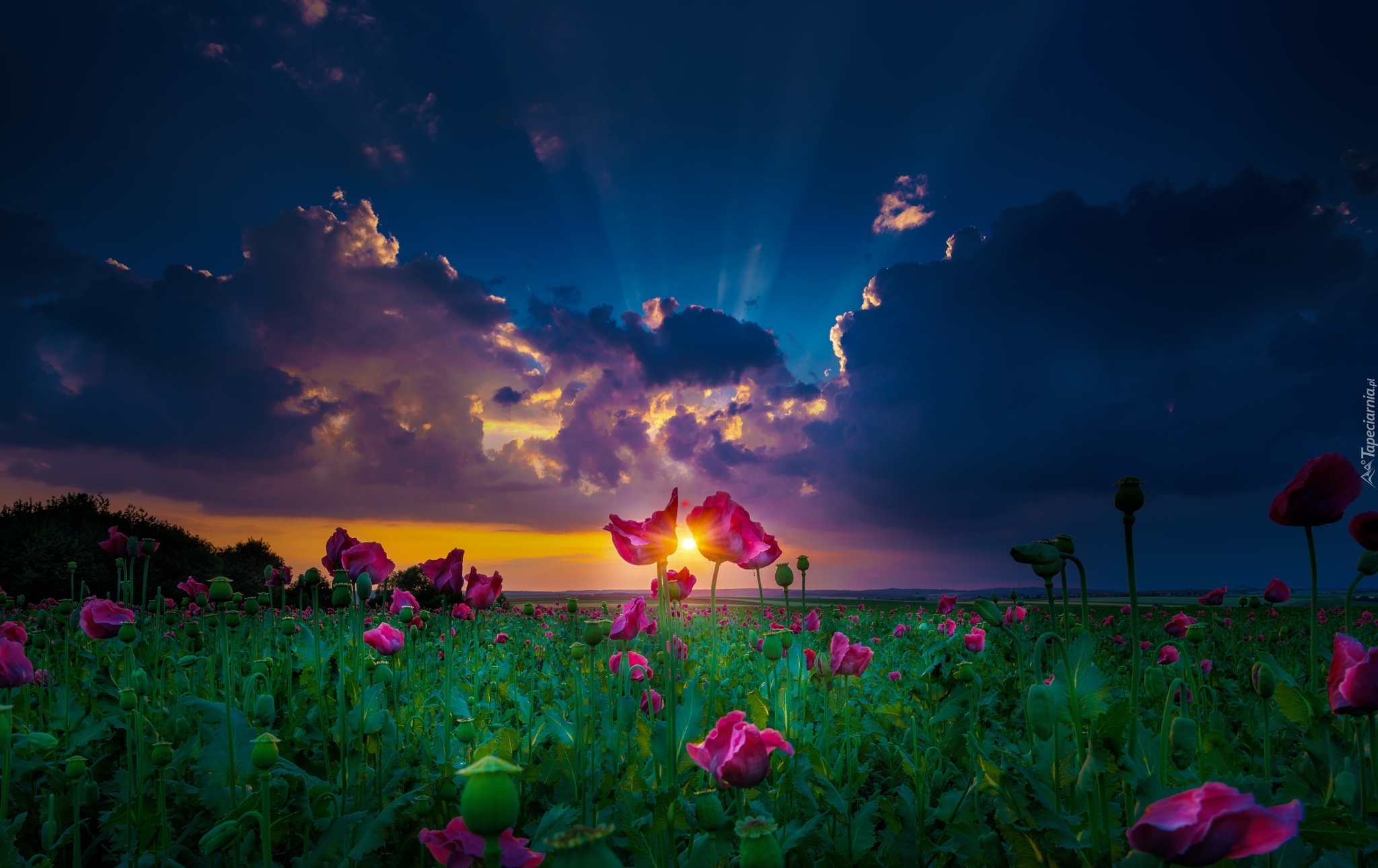 Edytor tapety: Zachód Słońca, Chmury, Kwiaty Maki