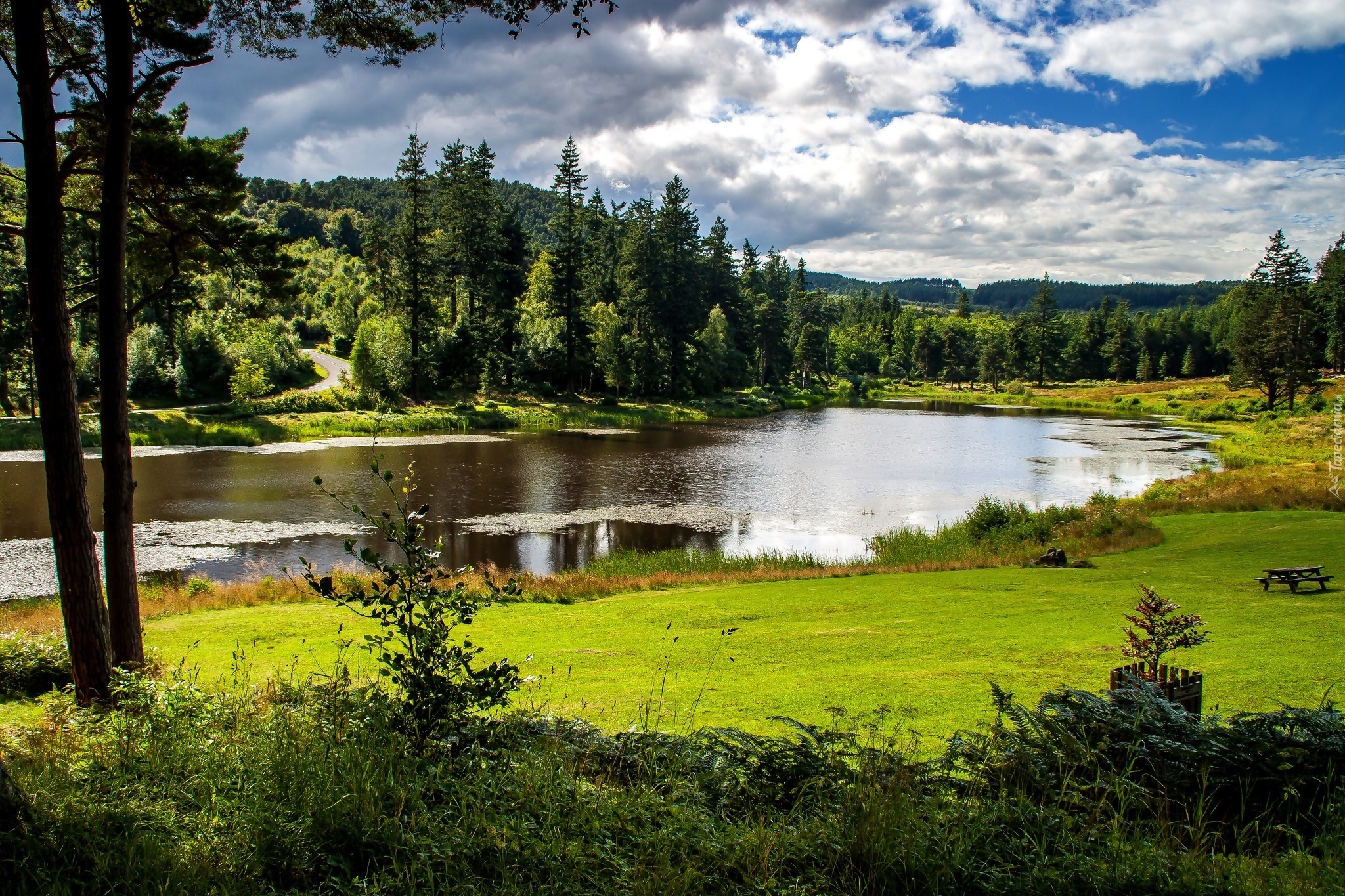 Edytor tapety: Rzeka, Wzgórza, Łąka