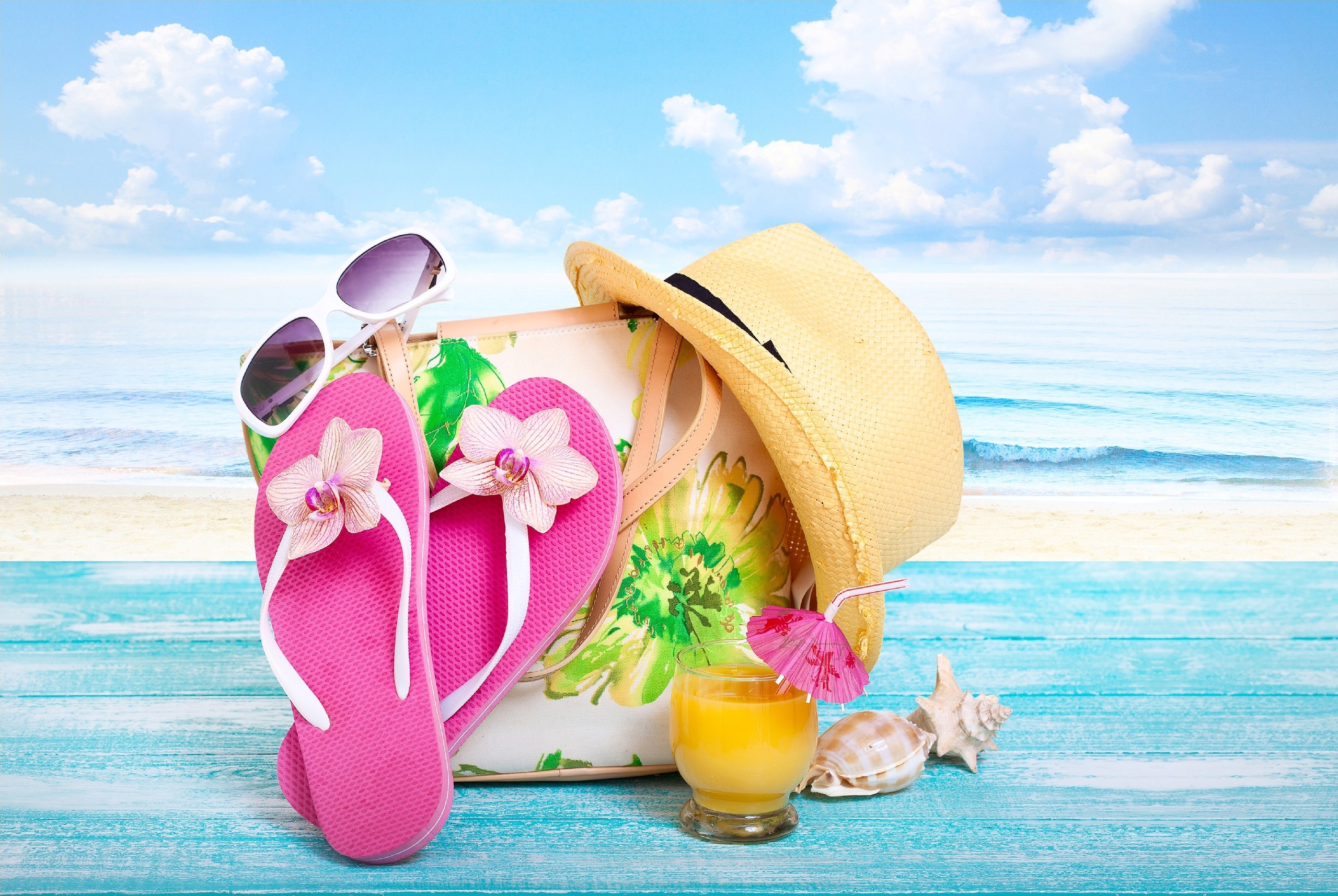 Edytor tapety: Lato, Morze, Klapki, Okulary, Kapelusz, Drink, Wakacje