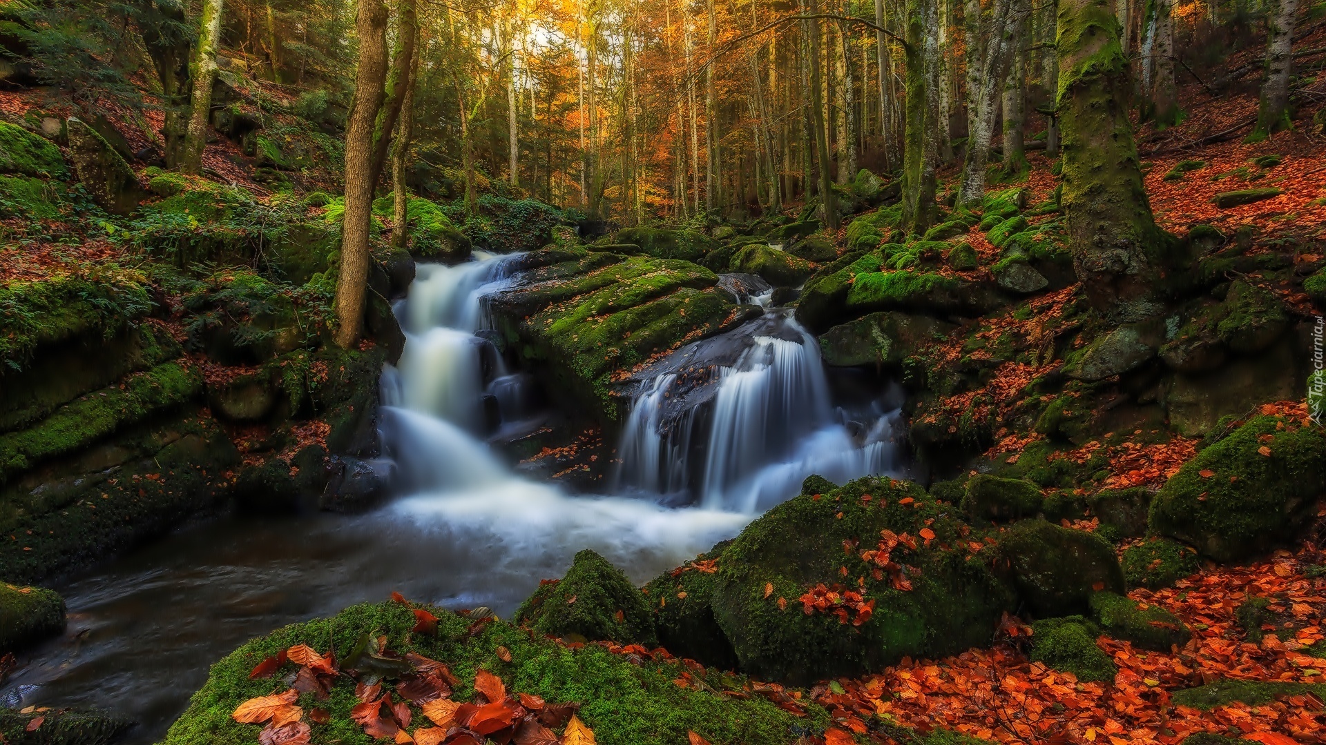 Edytor tapety: Jesień, Las, Wodospad, Kamienie, Skały