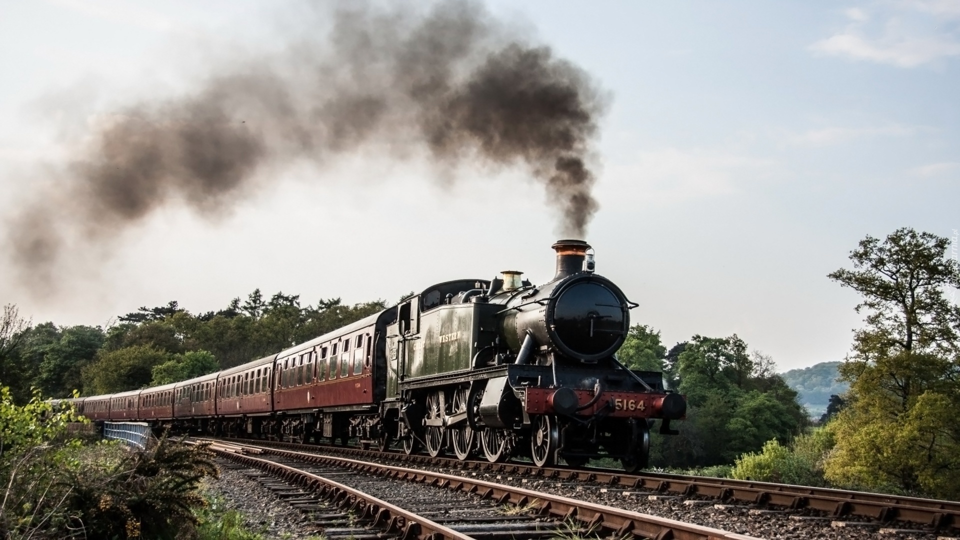 Edytor tapety: Pociąg, Parowóz, Wagony, Tory, Drzewa