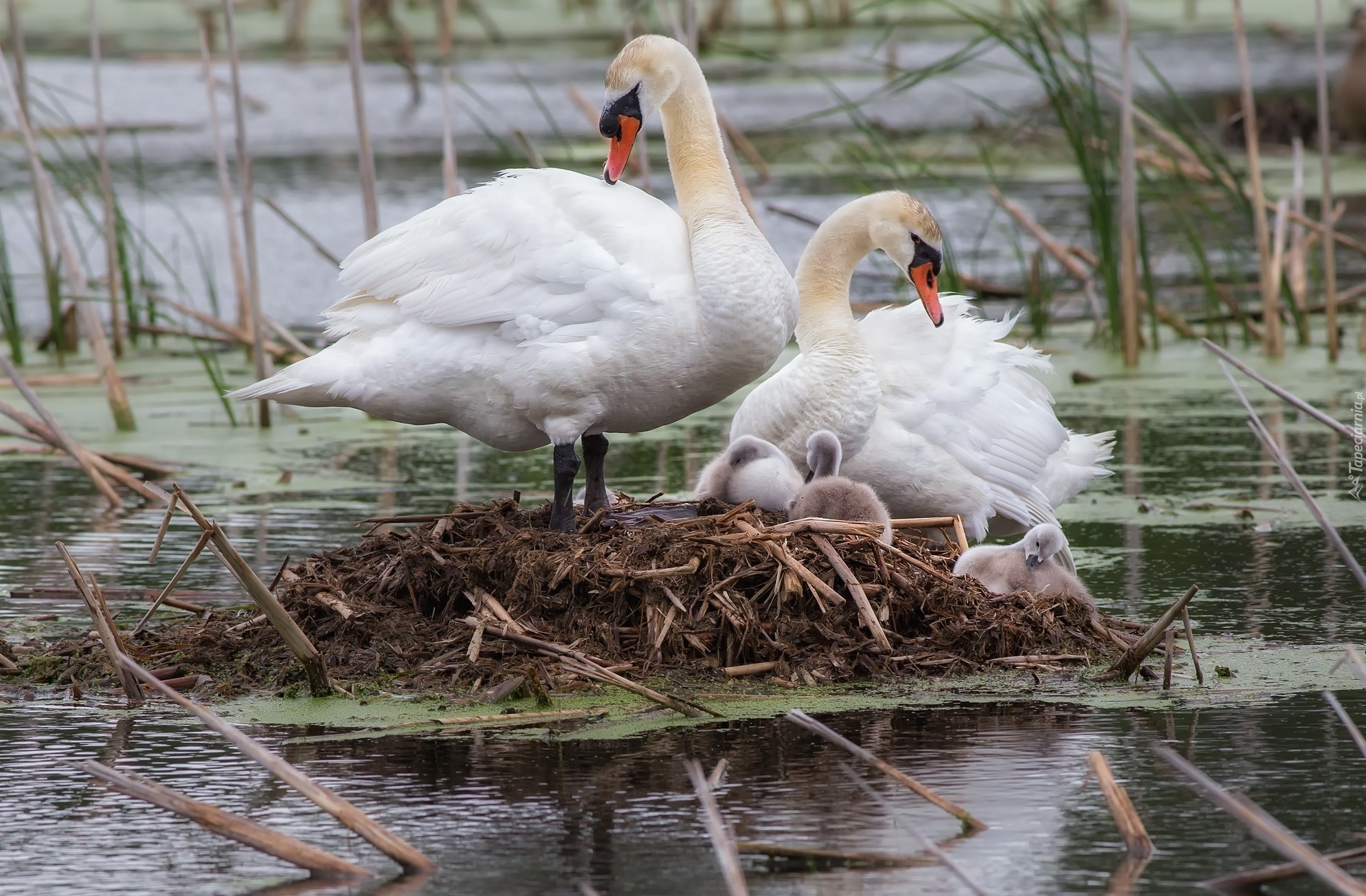 Edytor tapety: Para, Łabędzi, Młode, Gniazdo