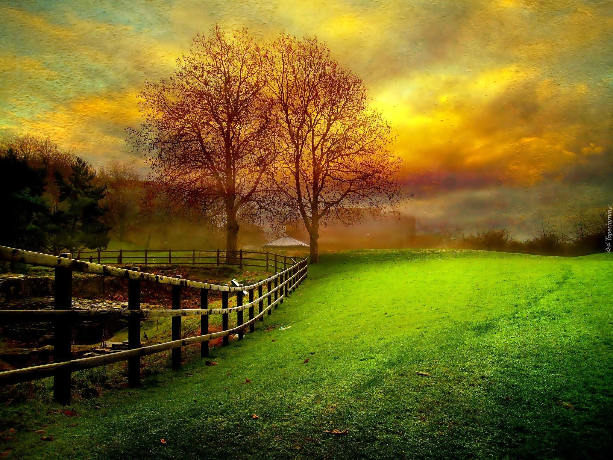 Edytor tapety: Chmury, Łąka, Drzewa, Płot