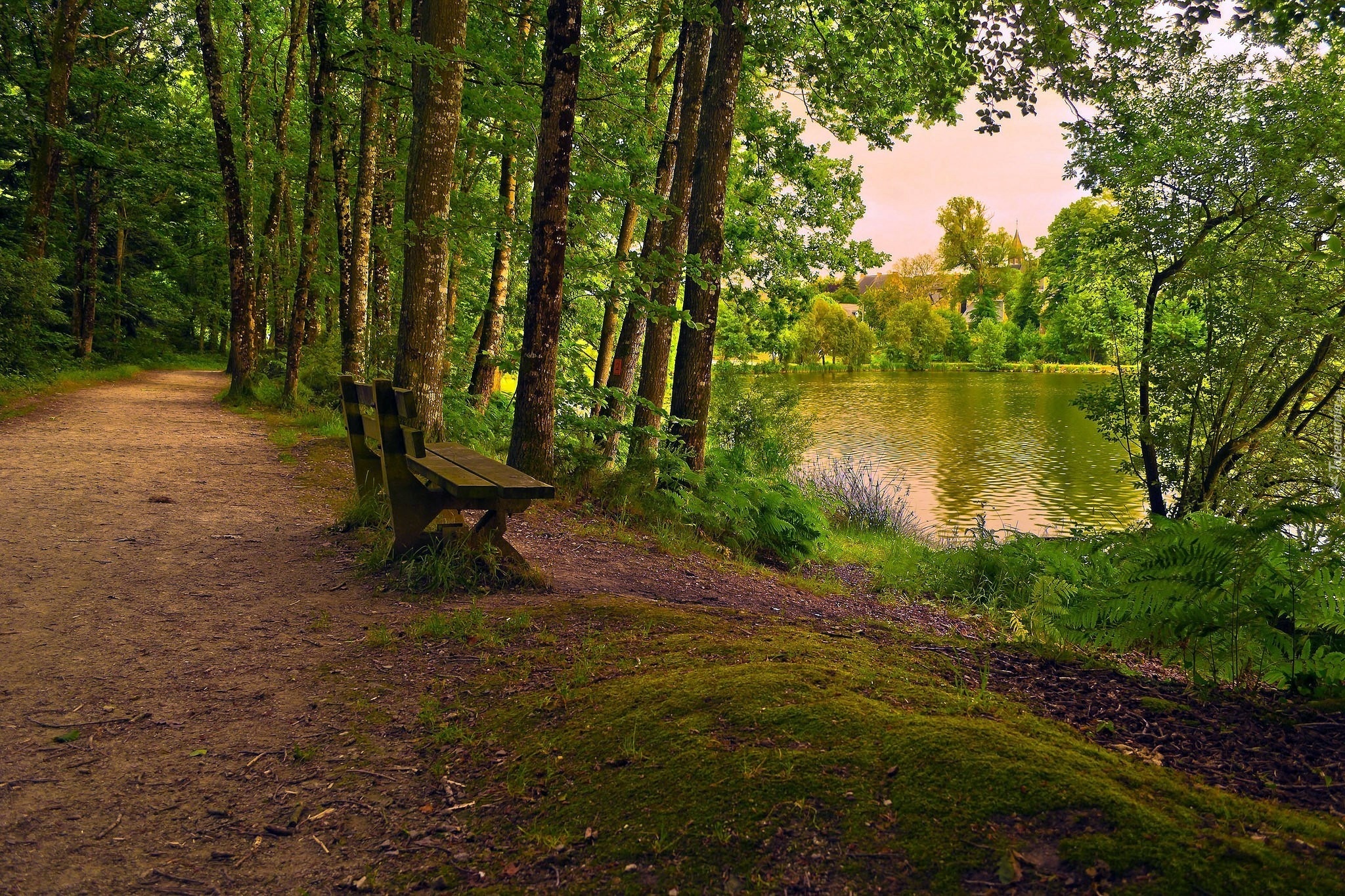 Edytor tapety: Las, Dróżka, Ławka, Staw, Budynki