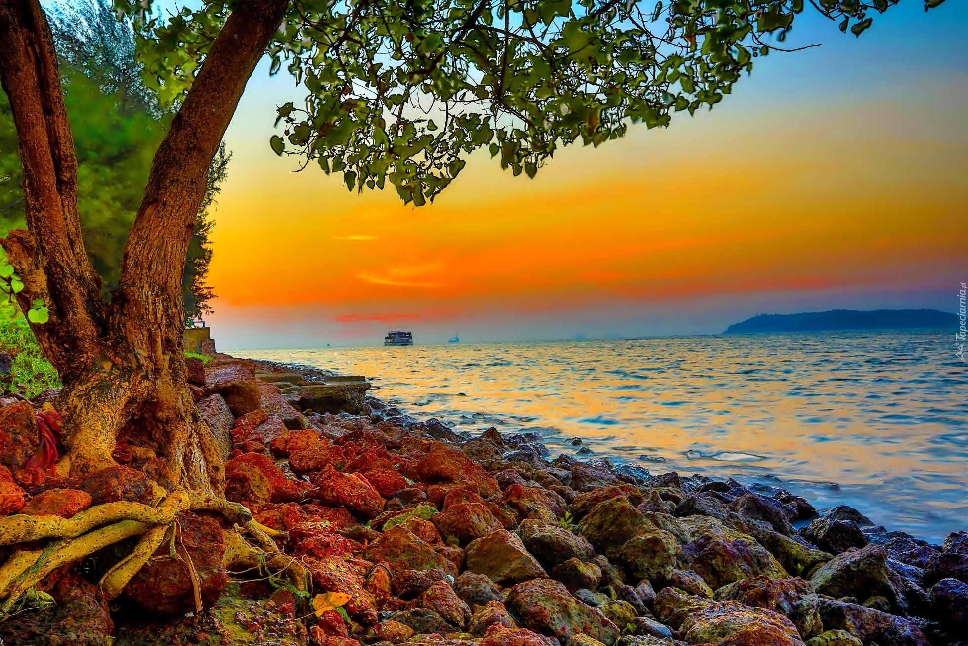 Edytor tapety: Morze, Kamienie, Zachód Słońca, Drzewo, Wybrzeże