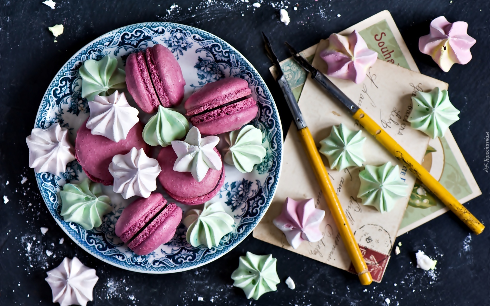 Edytor tapety: Ciasteczka, Bezy, Talerz, Kartki, Pióra