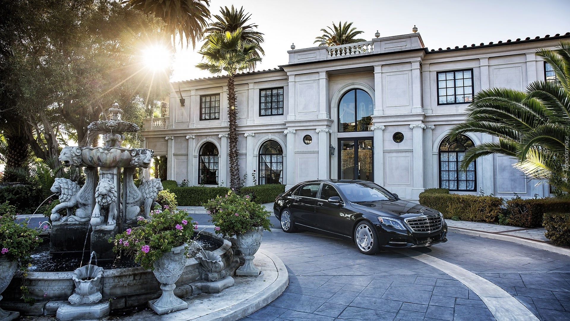 Edytor tapety: Dom, Posesja, Podjazd, Fontanna, Samochód, Mercedes