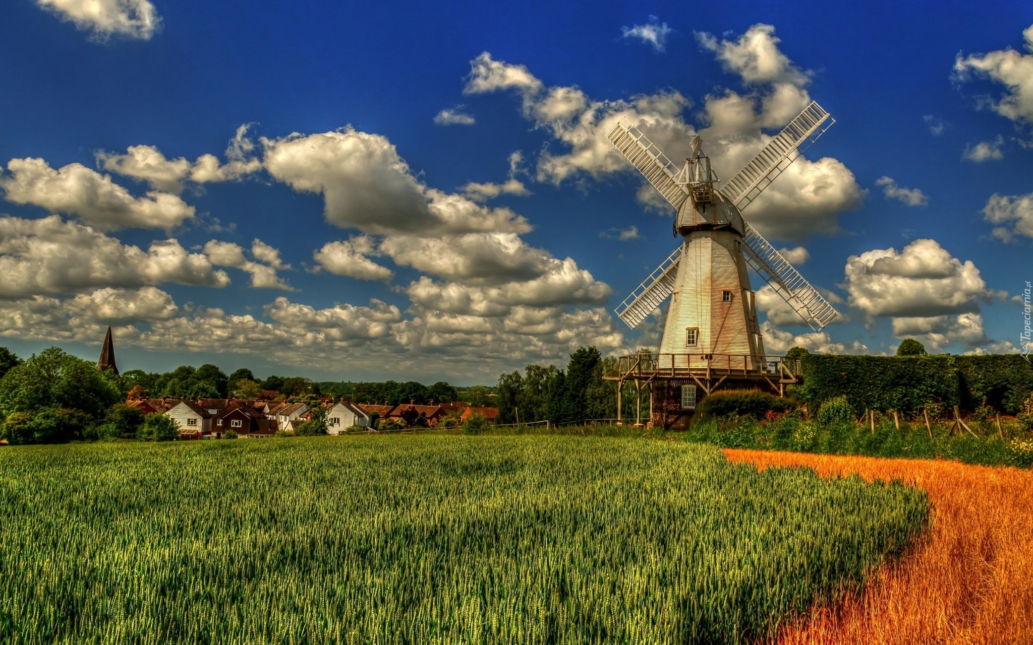Edytor tapety: Wiatrak, Pole, Niebo, Obłoki, Wieś