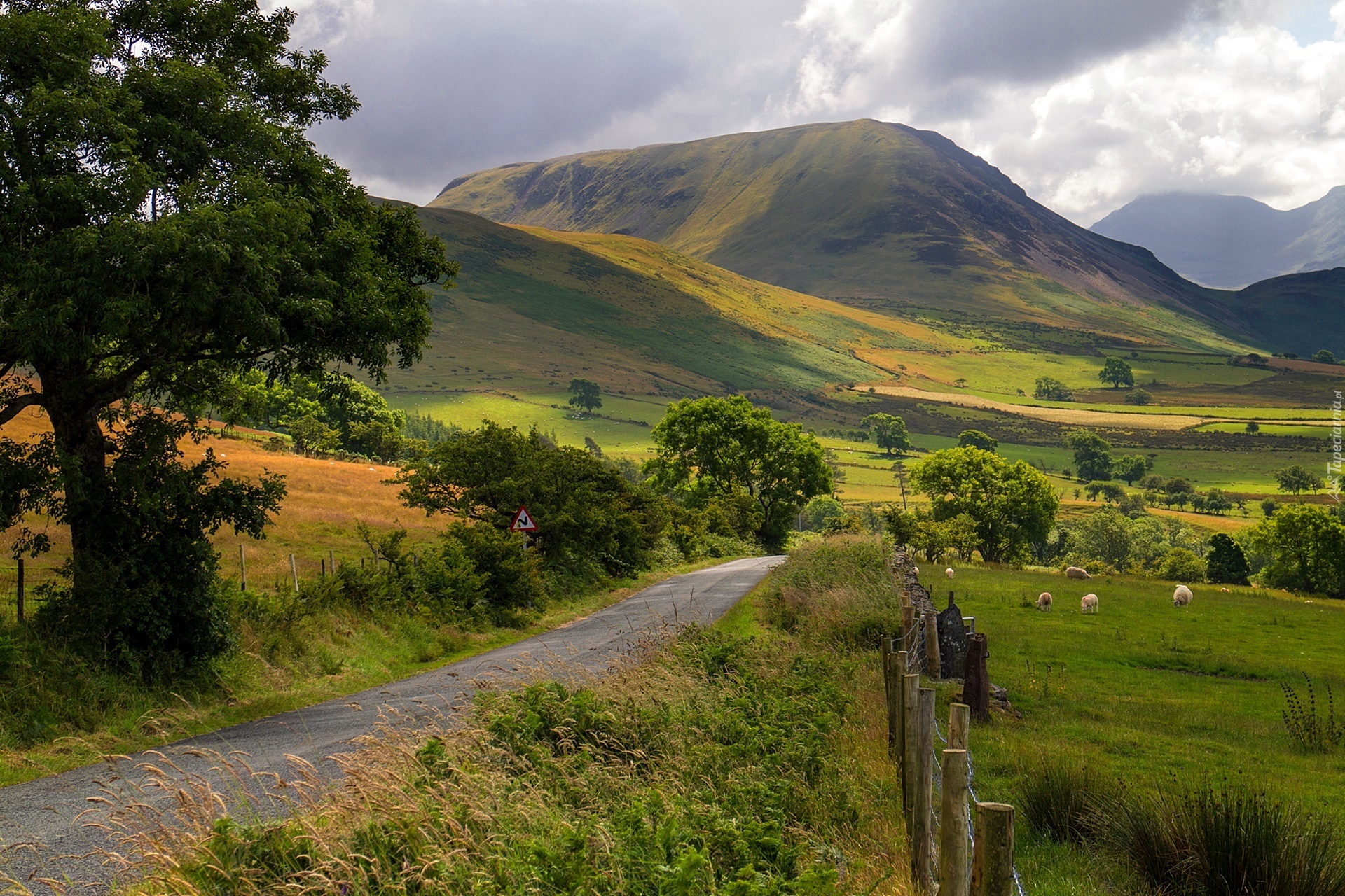 Edytor tapety: Droga, Łąka, Owce, Góry, Krajobraz
