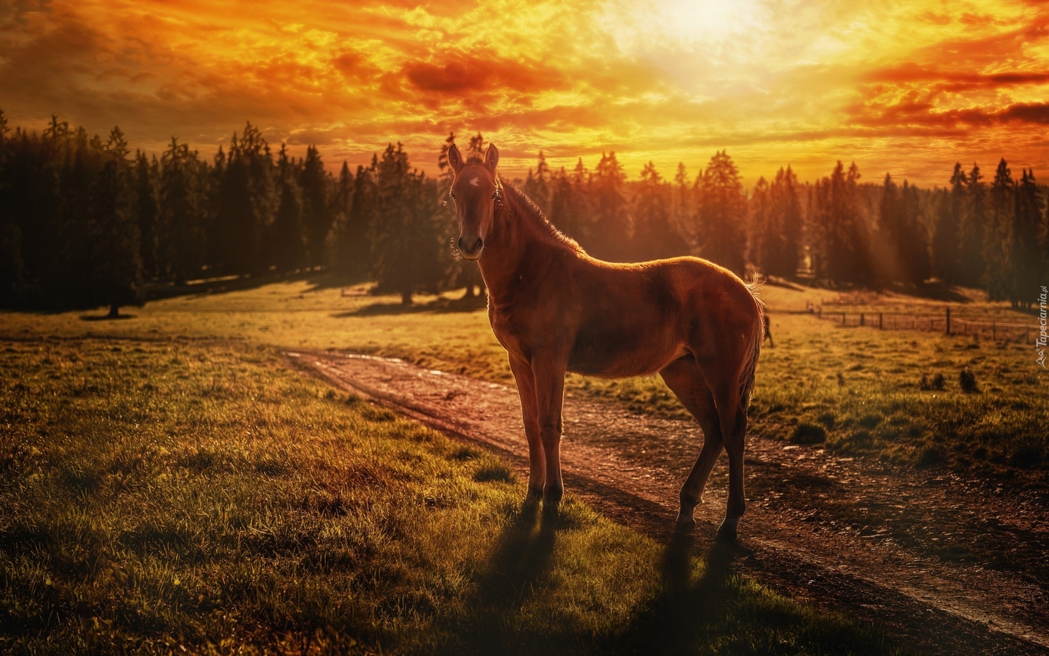 Edytor tapety: Koń, Zachód Słońca, Las