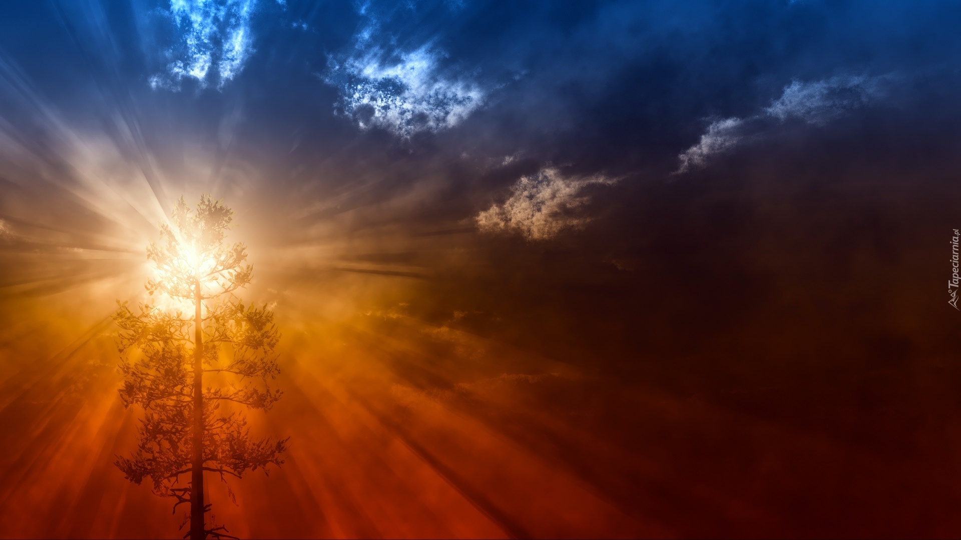 Edytor tapety: Zachód słońca, Promienie, Drzewo